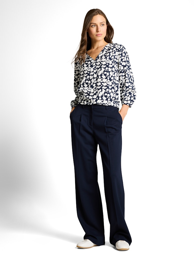 Bluse mit 3/4-Arm, V-Ausschnitt und Knopfleiste. Mit elastischem Gummibund am Ärmelsaum und leichten Raffungen an den Schultern. Aus einem fließenden Viskose-Stoff.