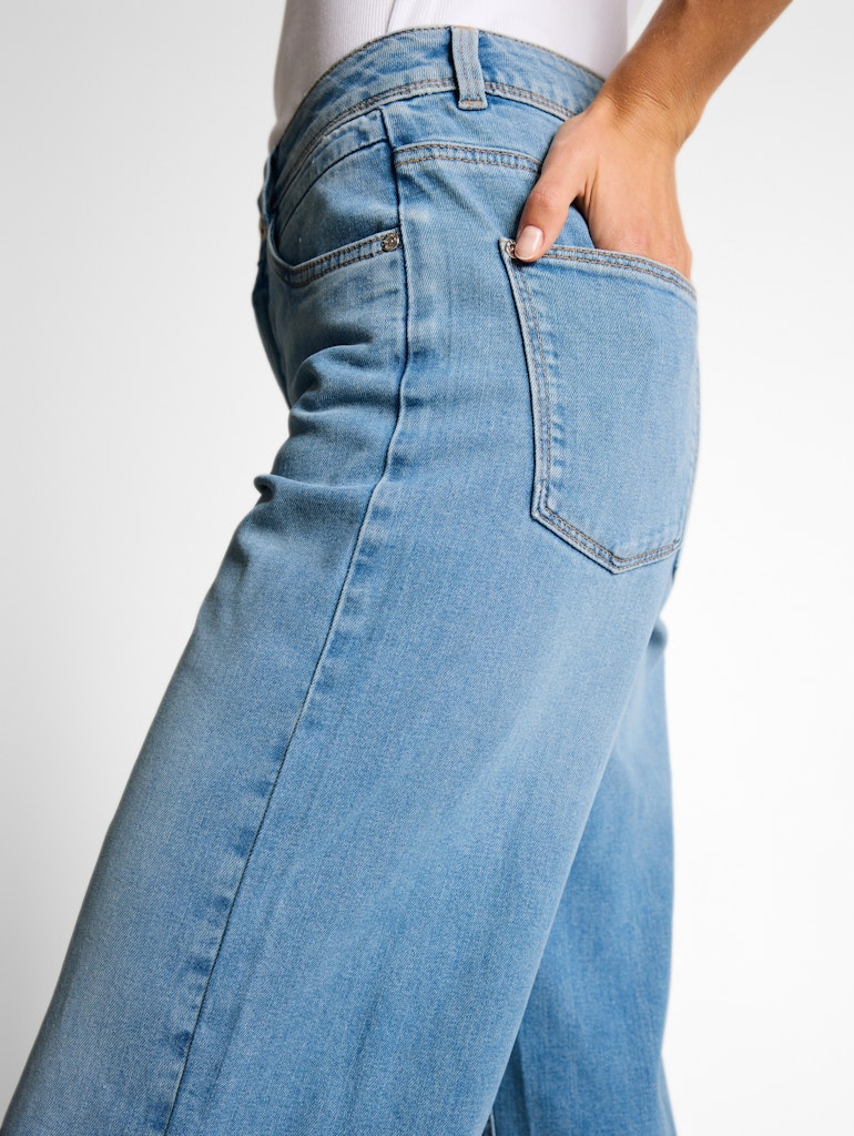 High Waist Culotte Jeanshose im Five-Pocket-Style mit seitlichen Eingriffstaschen vorne und aufgesetzten Taschen hinten. Leichter Stretch-Anteil sorgt für mehr Bewegungsfreiheit und einen angenehmen Tragekomfort.