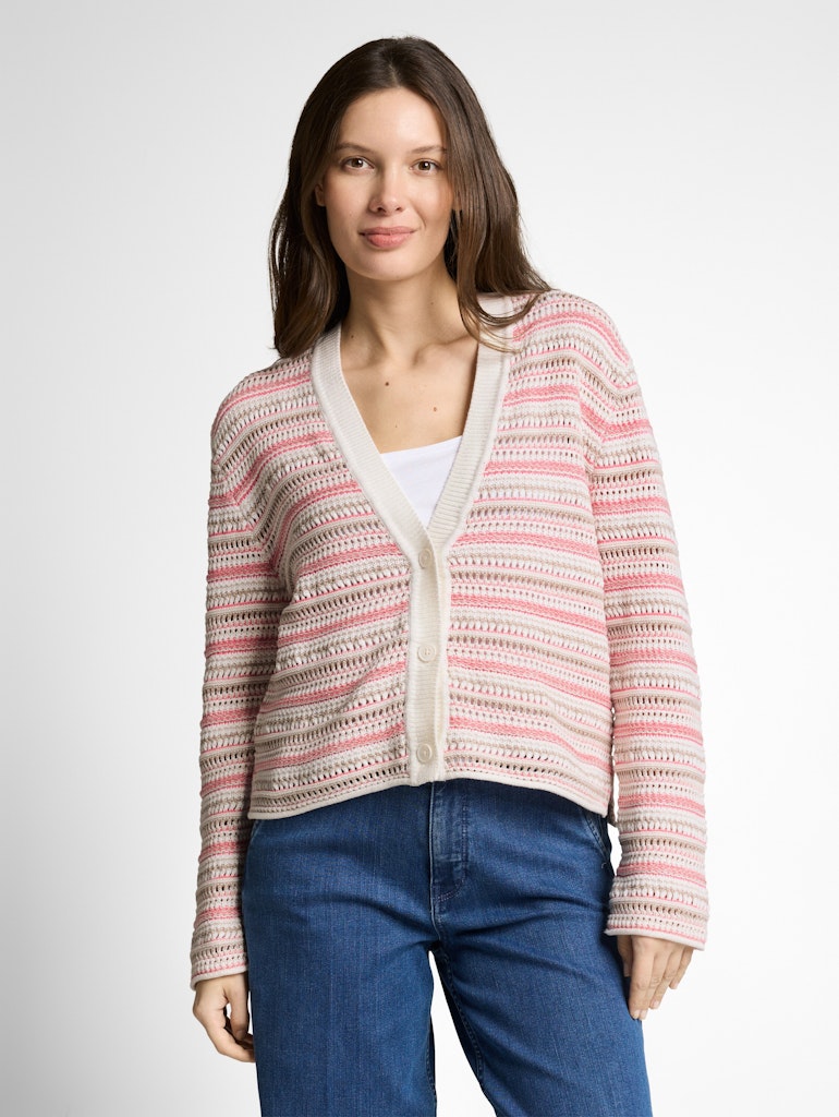 Gestreifte, locker geschnittene Strickjacke aus Baumwolle mit Lochmuster und V-Ausschnitt. Mit gerollten Saumkanten und kurzen Seitenschlitzen.
