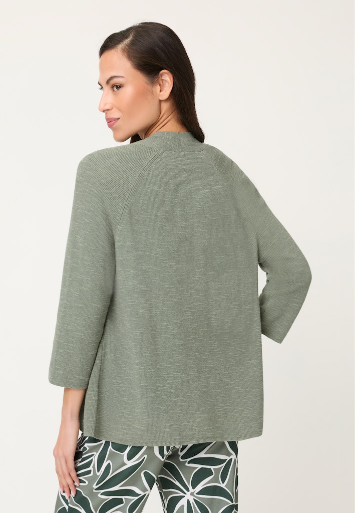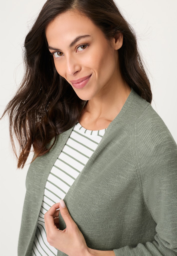 Dieser Cardigan überzeugt mit einem zeitlosen, cleanen Design und vielseitiger Kombinierbarkeit. Der weich fallende Schalkragen unterstreicht die feminine Linie, während die 3/4-Ärmel mit Raglanform für eine entspannte, moderne Silhouette sorgen. Die offene Form verleiht dem Modell eine lässige Leichtigkeit und macht es zum idealen Layering-Piece für jeden Tag. Der angenehm softe Materialmix rundet den komfortablen Look ab. Länge ca. 58 cm.