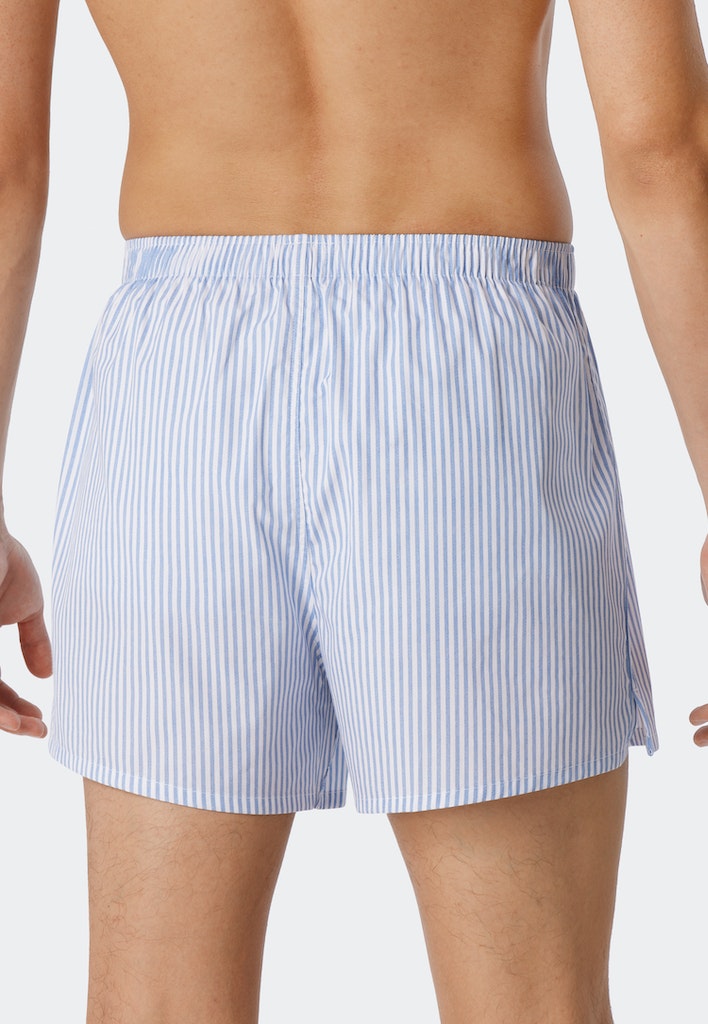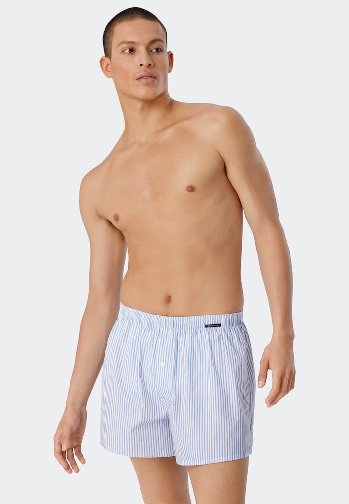 Herren-Boxershorts im Zweierpack: 1x dunkelblau, 1x hellblau weiß gestreift, aus der SCHIESSER-Serie "Fun Prints", zwei verschiedene Designs im Doppelpack, ideal als Geschenk, beide Shorts mit funktionaler Knopfleiste und einem sichtbaren Knopf, elastischer Mehrnadelbund mit schwarzem SCHIESSER-Weblabel, zu 100% aus hautsympathischer, waschbeständiger Baumwolle, aus hochwertiger Webware