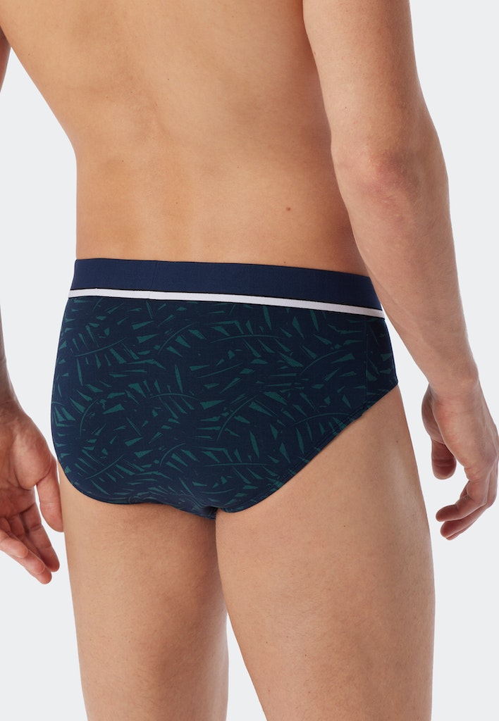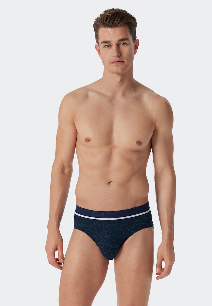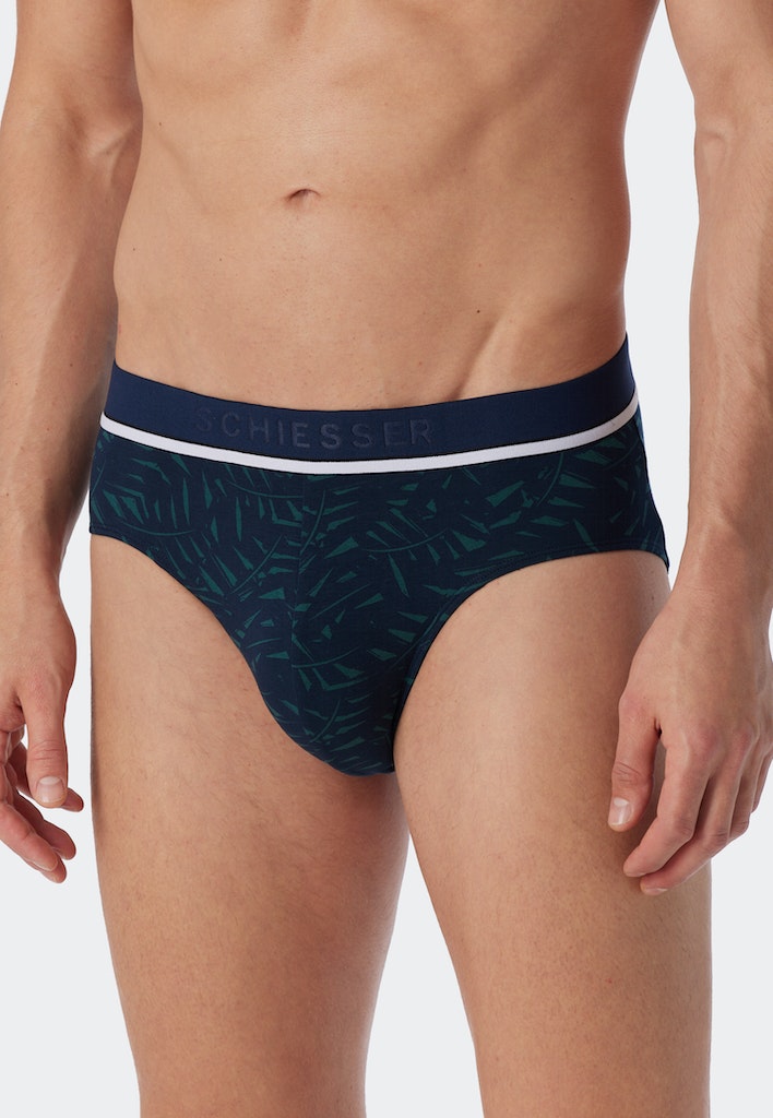 Rio-Slips für Herren: 2x Schwarz, 1x gemustert in Dunkelblau mit rotem Blätter-Print, aus der beliebten SCHIESSER-Serie "95/5", im praktischen Dreierpack, mit sportlichem Logo-Webgummibund mit weißer, dekorativer Linie, angenehm weich und formstabil dank 95% natürlichem Organic Cotton und 5% Elastan, in perfekt sitzender, elastischer Single-Jersey-Qualität
