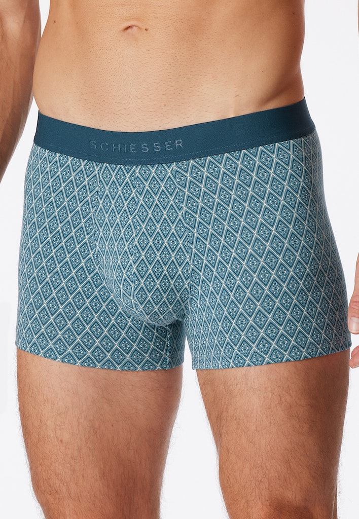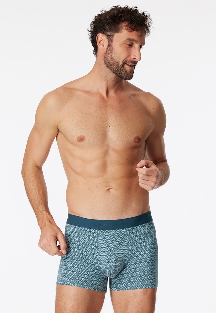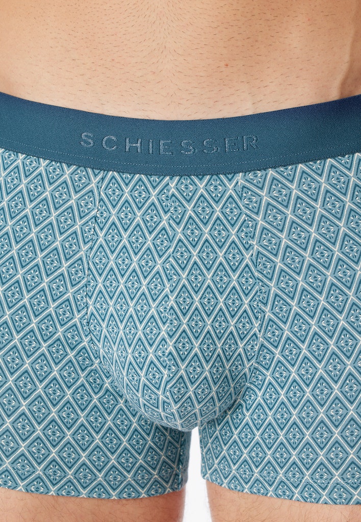Herren-Shorts im 3er-Pack (2x dunkelblau, 1x graublau-dunkelblau mit Rautenmuster), aus der beliebten SCHIESSER Serie "95/5", angenehm softer Logo-Webgummibund, angenehm weich und formstabil dank 95 % natürlichem Organic Cotton und 5 % Elastan, unsere Models sind 186 cm bzw. 187 cm groß und tragen Größe 50/M, in perfekt sitzender, elastischer Single-Jersey-Qualität