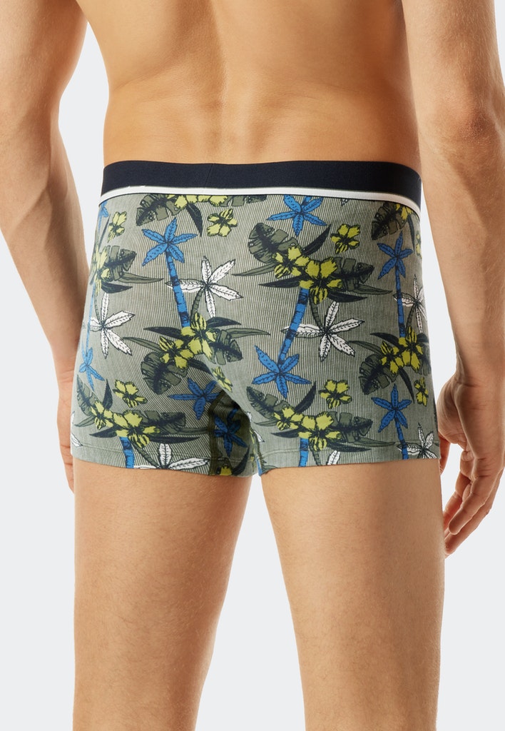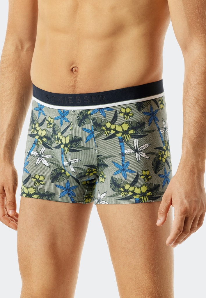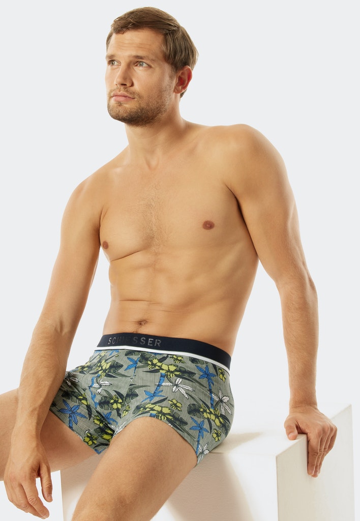 Shorts für Herren: 1x Dunkelblau, 1x Khaki und 1x mit Streifen und Blumen-Print in Gelb-Blau, aus der beliebten SCHIESSER-Serie "95/5", im praktischen Dreierpack, mit sportlichem Logo-Webgummibund mit weißer, dekorativer Linie, angenehm weich und formstabil dank 95% natürlichem Organic Cotton und 5% Elastan, in perfekt sitzender, elastischer Single-Jersey-Qualität