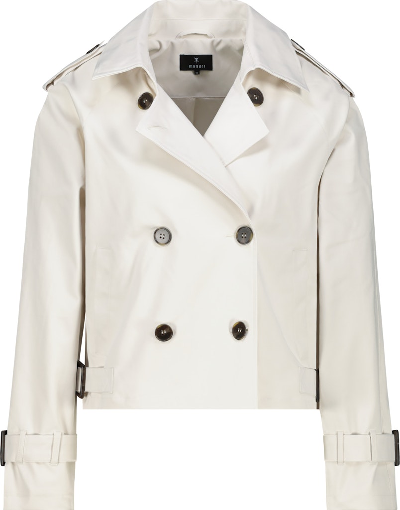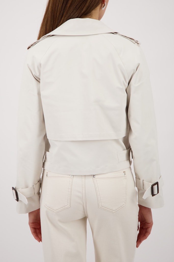 Die kurze, stylische Trenchjacke überzeugt mit Schulterriegeln, Ärmel- und Seitenriegeln mit Schnalle sowie einer doppelten Knopfleiste.