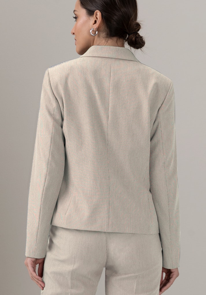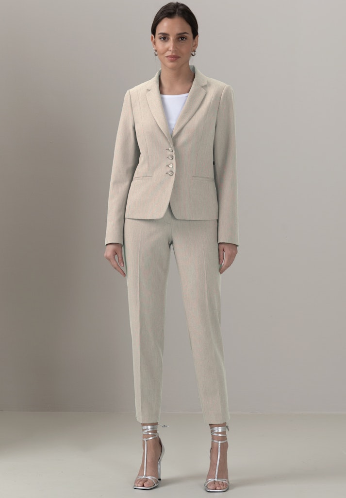 Unser Kurzblazer Vivette begeistert mit seinem eleganten Fil-a-Fil-Dessin und einer hochwertigen Verarbeitung. Der Materialmix mit Elasthan bietet ein angenehmes Tragegefühl und optimale Bewegungsfreiheit. Der moderne 4-Knopf-Verschluss, die Taschen und der klassische Reverskragen verleihen dem langärmligen Blazer eine stilvolle Note. Ob für formelle Anlässe oder den Alltag - Vivette ist ein vielseitiges Kombitalent. Zusammen mit der passenden Hose Siena entsteht ein harmonischer Hosenanzug, der jeden Kleiderschrank bereichert.