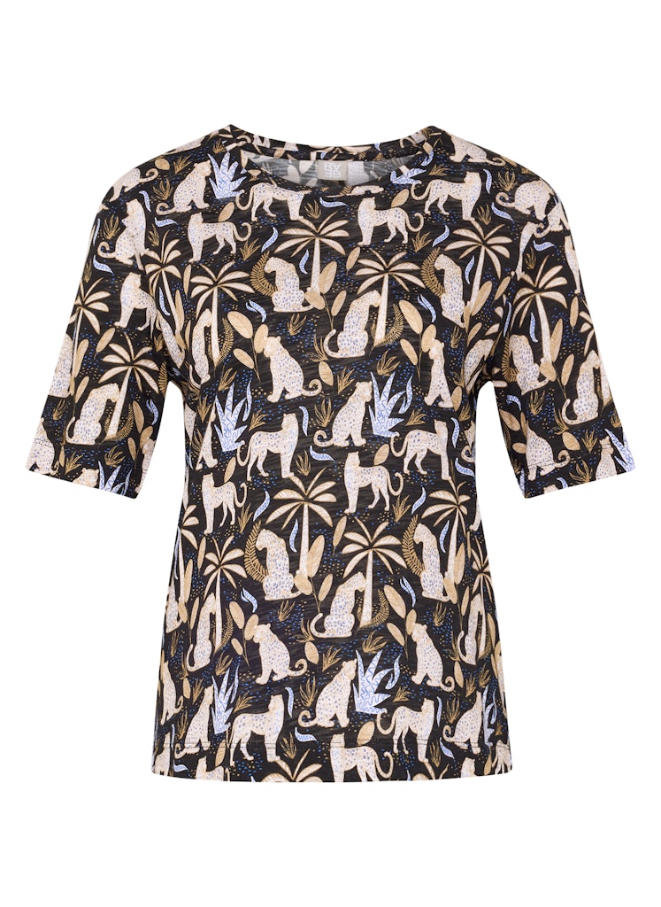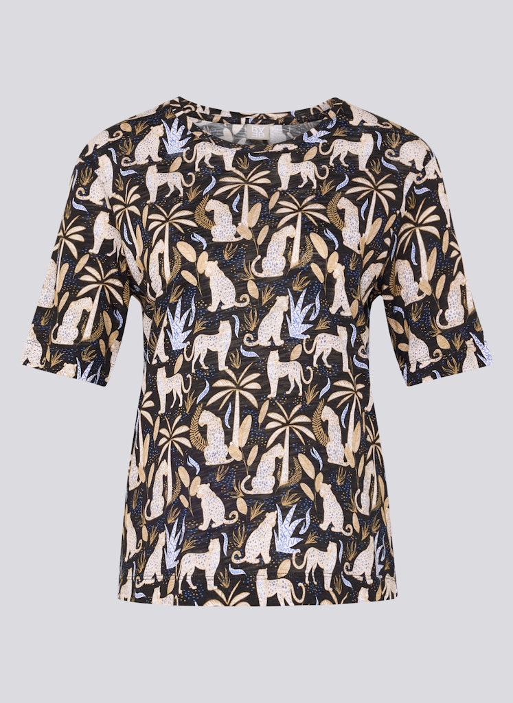 Dieses Shirt überzeugt mit einer angenehmen Materialmischung aus Baumwolle und Viskose, die sich weich auf der Haut anfühlt und zugleich für eine fließende, leichte Qualität sorgt. Der klassische Rundhalsausschnitt und die halblangen Ärmel unterstreichen den unkomplizierten Charakter. Das ausdrucksstarke Allover-Dessin mit exotischen Motiven verleiht dem Modell eine besondere Note und macht es zum Blickfang in modernen Freizeit-Outfits. Baumwolle-Viskose-Mischung. Weiche, fließende Qualität. Rundhalsausschnitt. Halblange Ärmel. Auffälliges Alloverdessin.
