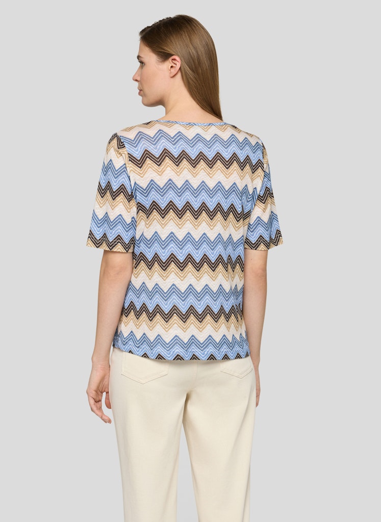 Angenehm weich und leicht zu tragen zeigt sich dieses Shirt aus einer komfortablen Baumwoll-Viskose-Mischung. Das Material verbindet hautfreundliche Eigenschaften mit einer fließenden Qualität und sorgt so für hohen Tragekomfort. Der klassische Rundhalsausschnitt und die halblangen Ärmel unterstreichen die zeitlose Form. Das ausdrucksstarke Zickzackdessin verleiht dem Modell eine dynamische Optik und macht es zu einem vielseitigen Begleiter für moderne Casual-Looks. Baumwolle-Viskose-Mischung. Weiche, fließende Qualität. Rundhalsausschnitt. Halblange Ärmel. Grafisches Zickzackdessin.