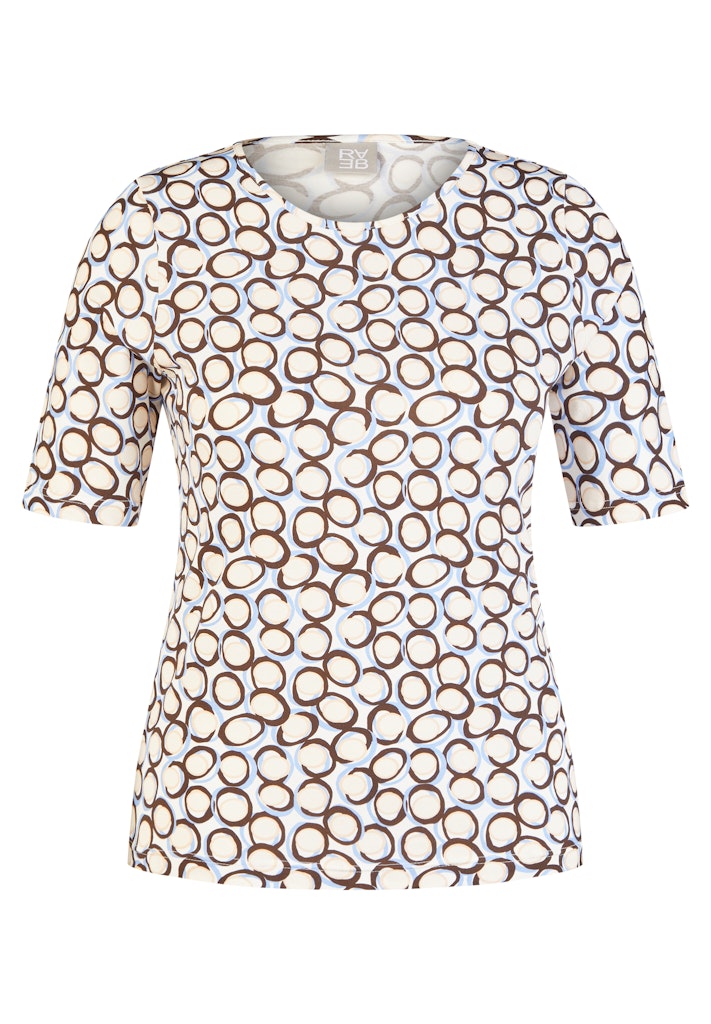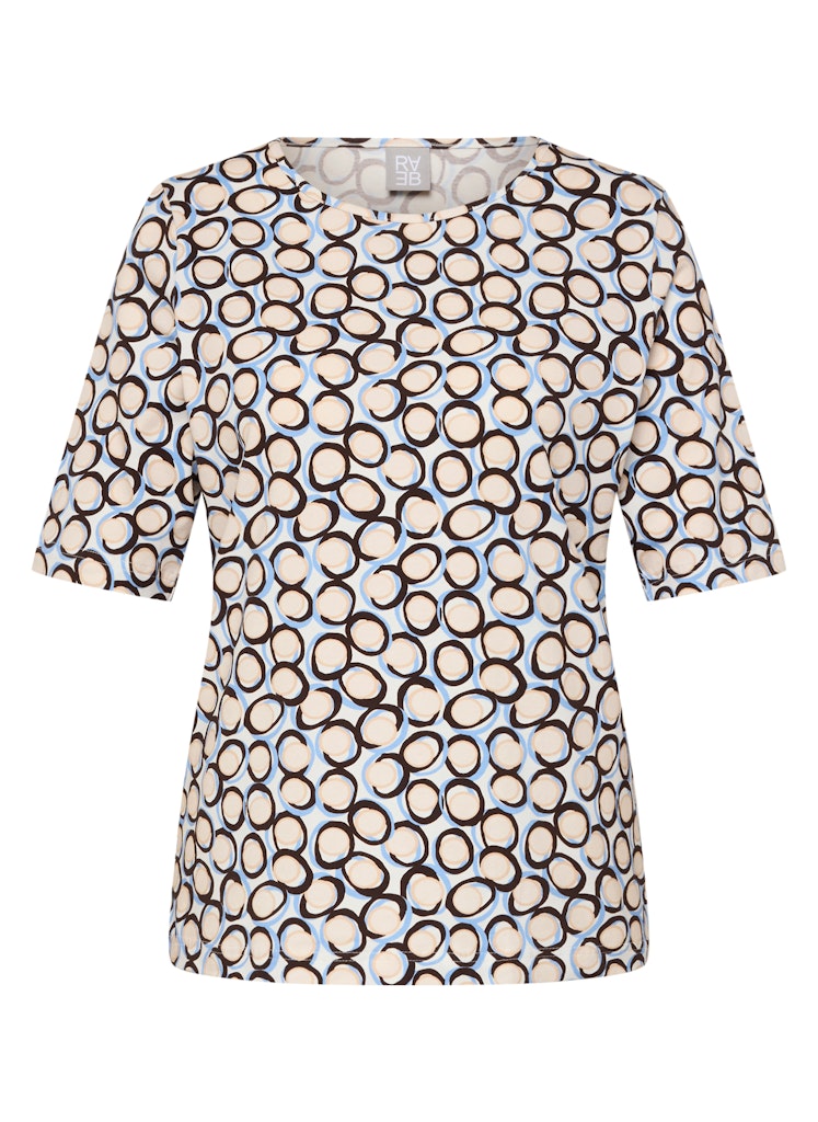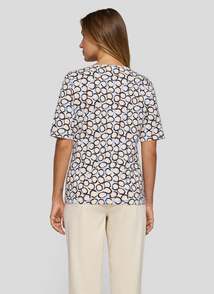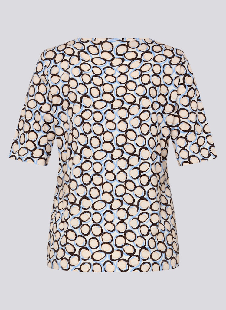 Dieses Shirt aus einer Baumwollmischung mit Elasthan trägt sich angenehm weich und passt sich durch den Stretchanteil komfortabel der Figur an. Die hochwertige Jersey-Qualität sorgt für Bewegungsfreiheit und ein gutes Hautgefühl. Der klassische Rundhalsausschnitt und die halblangen Ärmel verleihen dem Modell eine zeitlose Silhouette. Das grafische Kreisdessin bringt frische Dynamik in den Look und macht das Shirt zu einem vielseitigen Kombipartner für den Alltag. Baumwolle mit Elasthan. Weiche Jersey-Qualität. Rundhalsausschnitt. Halblange Ärmel. Grafisches Alloverdessin.