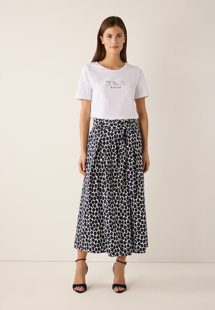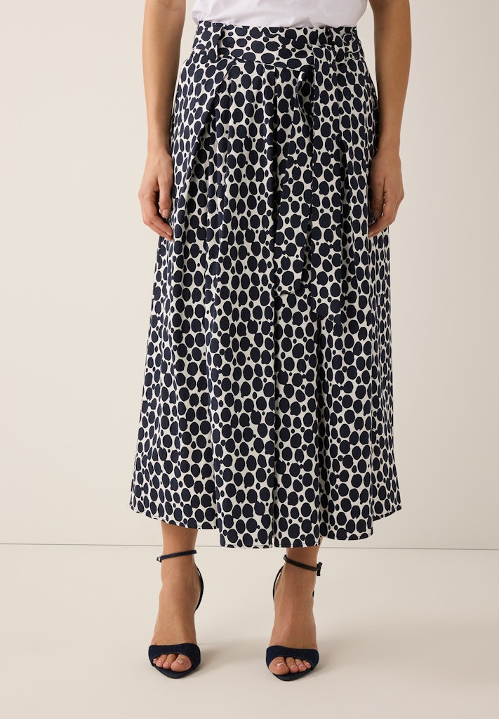 Den weit-ausgestellten Baumwollrock von MORE & MORE mit 2-farbigem Tupfen-Print in marine/ecru und Bindegürtel können Sie ganz casual mit T-Shirt und Sneakers stylen oder aber etwas eleganter mit Blusentop und Heels.