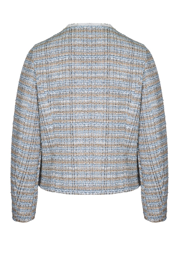 Unsere neue Boucléjacke Kathi setzt stilvolle Akzente und verleiht jedem Outfit eine besondere Note. Der hochwertige Materialmix mit Elasthan sorgt für ein angenehmes Tragegefühl. Feine Fransen am Rundhalsausschnitt und entlang der vorderen Kante sowie ein verdeckter Hakenverschluss unterstreichen den edlen Look. Das softe Jerseymaterial und die langen Ärmel machen Kathi zum idealen Begleiter zum Überziehen, perfekt, um schlichte Outfits im Handumdrehen aufzuwerten.