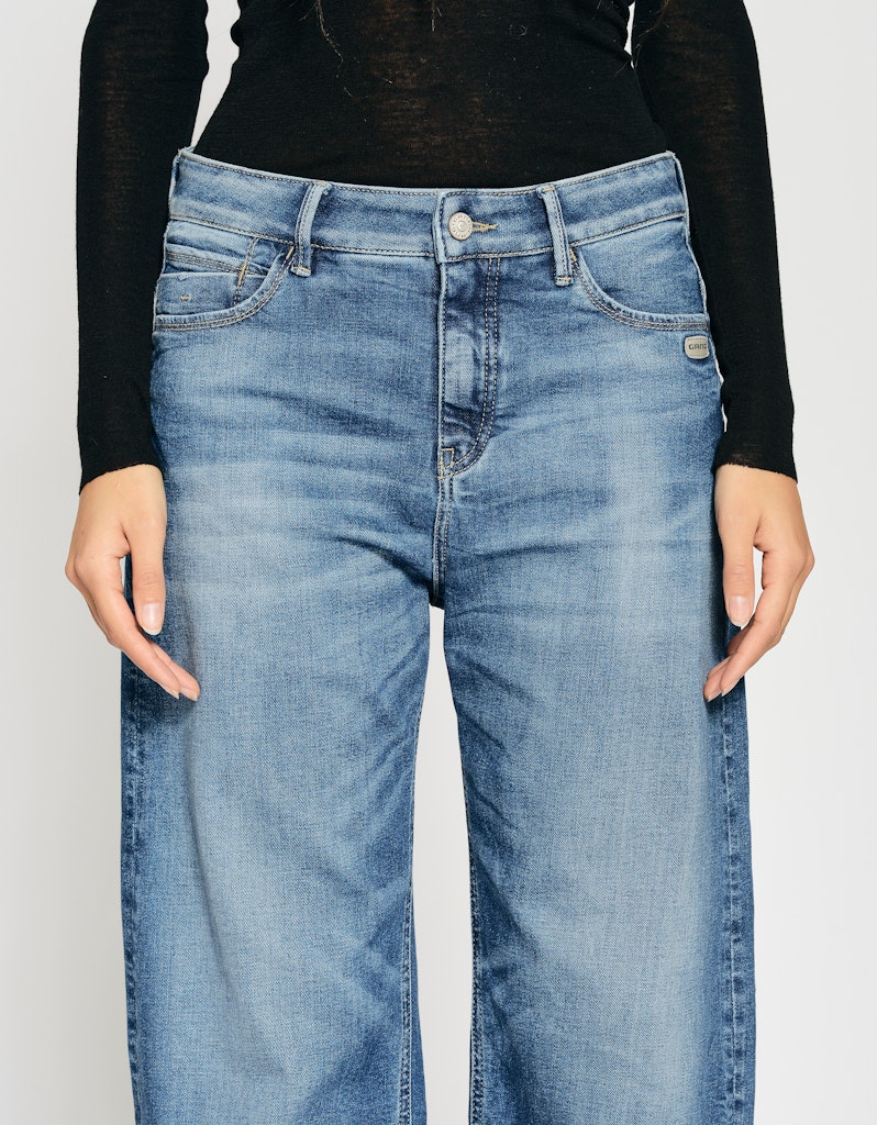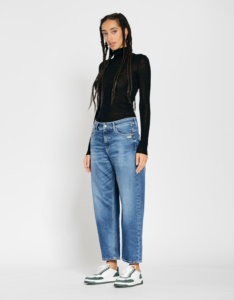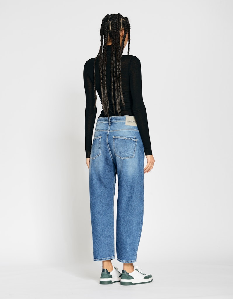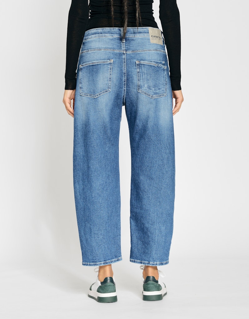 O-Shape Hose mit mittlerer Leibhöhe und verkürzter Beinlänge. Weicher Denim. Besonderes Gesäßtaschendetail. 5-Pocket Style mit Reißverschluss und Knopf. Zum Saum hin leicht konisch.