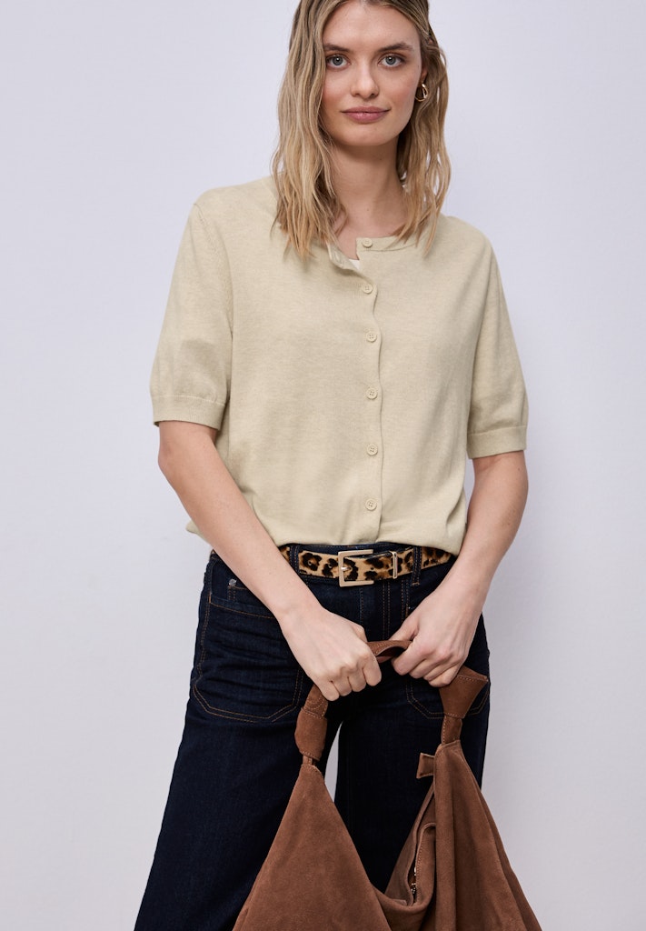 Dieser leichte Cardigan aus softem Viskosemix von Street One für Damen ist die perfekte sommerliche Ergänzung für deine Casual-Garderobe. Der Rundhals und die tonale Knopfleiste verleihen dem Design eine schlichte, feminine Note. Die Kurzarm-Variante sorgt für ein luftiges Tragegefühl. Ein vielseitiges Basic, das du unkompliziert über Tops oder Kleidern tragen kannst. Strickjacke Casual Rundhals Kurzarm Sommerliche Variante Material: 60% Viskose, 40% Baumwolle