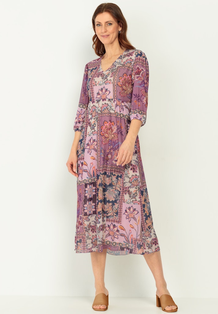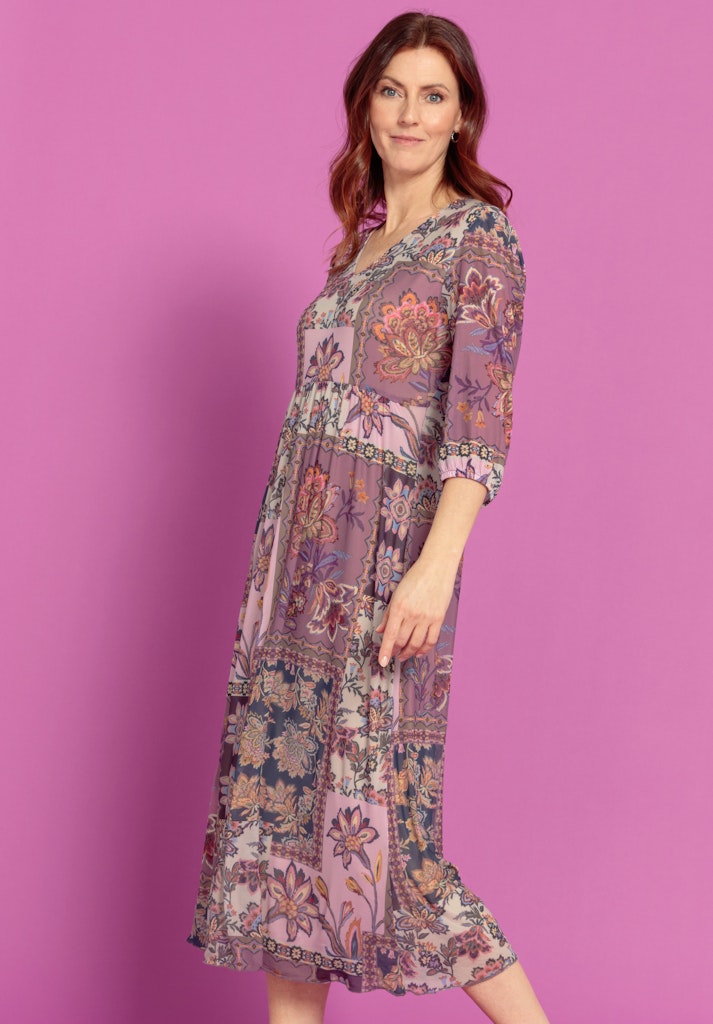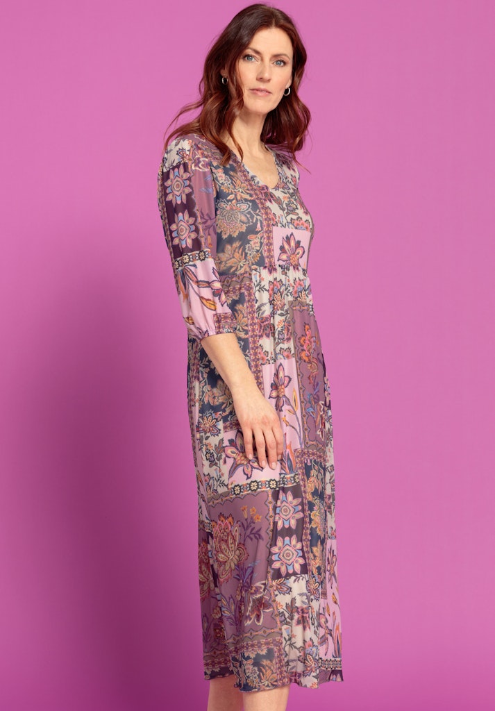 Perfekt für die neue Saison: Unser cooles Mesh-Kleid Adriana begeistert mit modernem Boho-Print, transparenten 3/4-Ärmeln und einem femininen V-Ausschnitt. Die locker fallende Passform mit leicht gekräuselter Taille und das weiche Jerseyfutter sorgen für angenehmen Tragekomfort. Kombiniert mit Sandalen oder Sneakern ist Adriana vielseitig tragbar - ob im Alltag oder zu besonderen Anlässen.