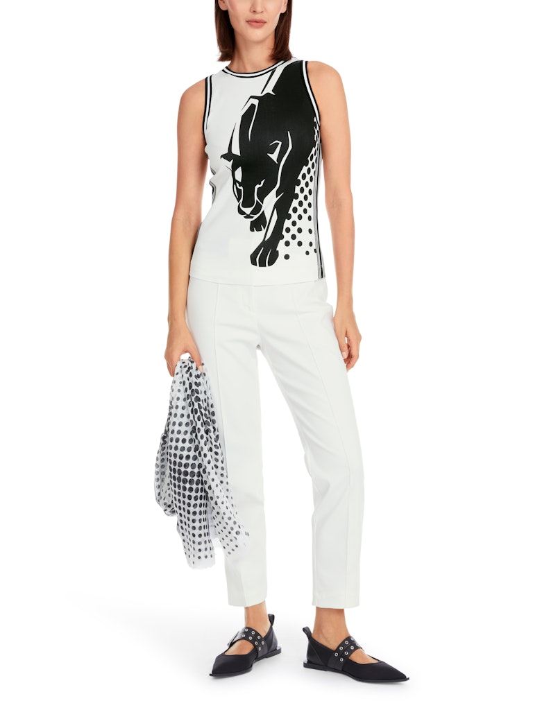 Ärmelloses Top mit Panther-Print|Schmal geschnittenes Top aus stretchigem Baumwoll-Ripp. Das Modell hat eine gerade Form, weite Ärmelausschnitte und einen Turtle Neck. Der Ringelstreif ist farblich variiert und die Front trägt den Marc Cain Schriftzug. Verleiht Looks einen Hauch von sportlicher Eleganz.|Gerade Form|Schmal geschnitten|Ärmellos|Rundhals|Das Model ist 179 cm groß und trägt N3/38.