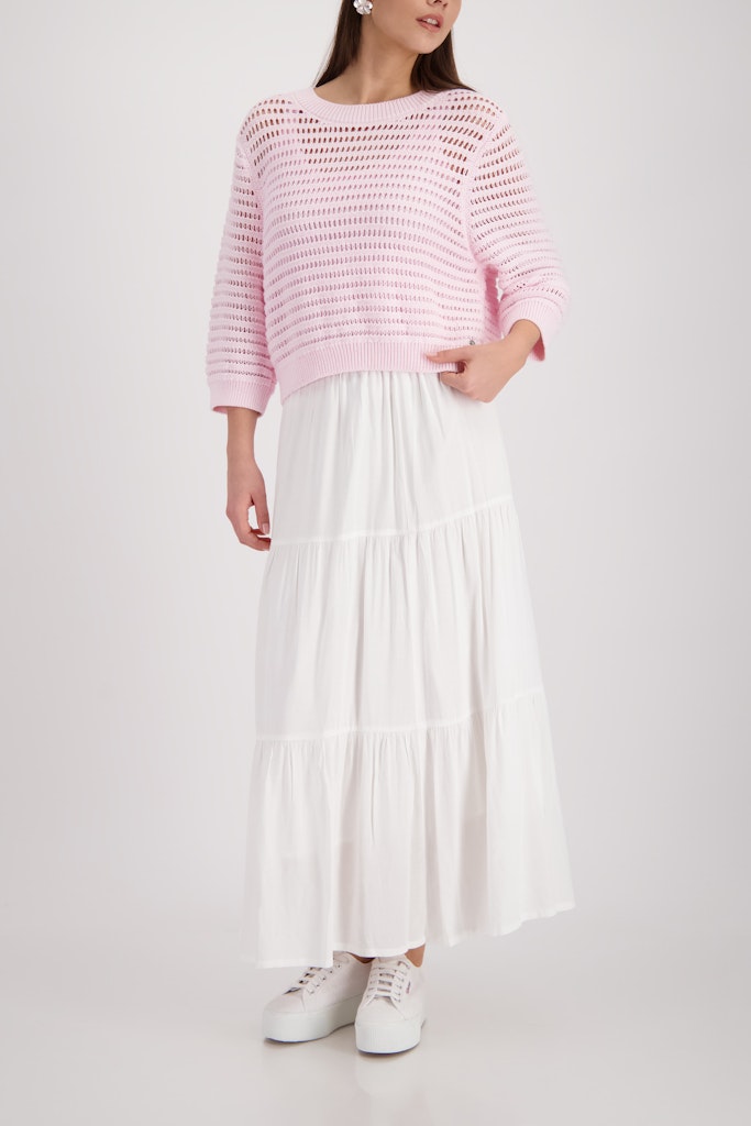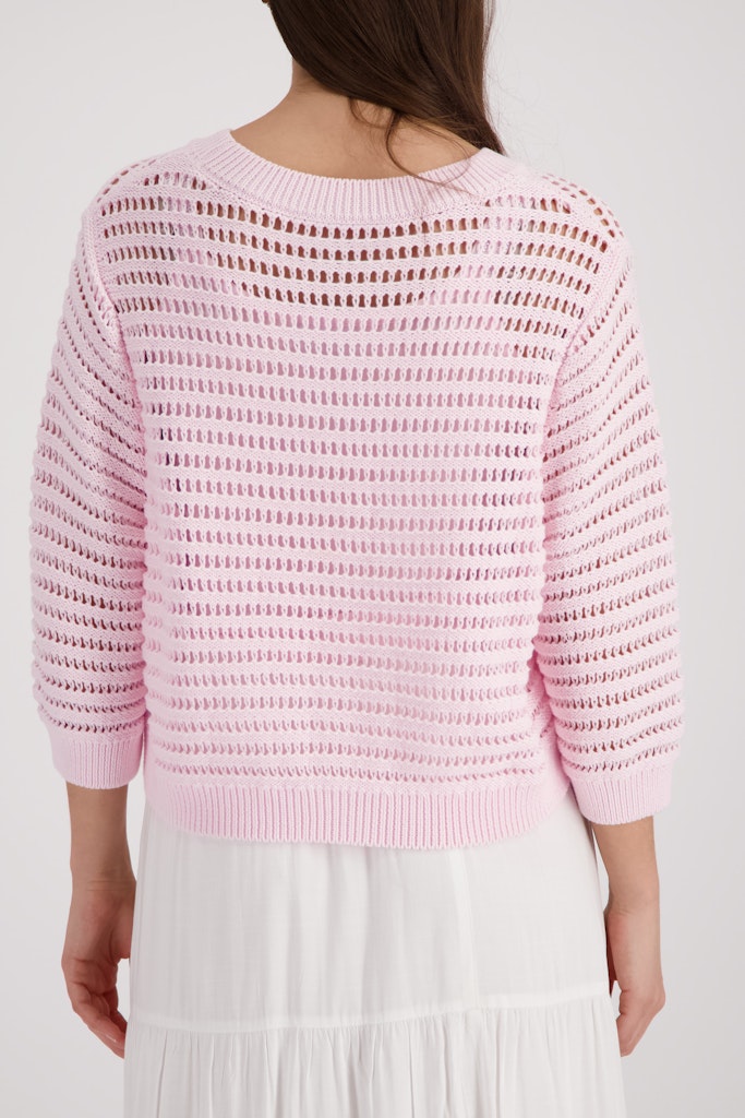 Moderner Ajour-Strickpullover aus 100% Baumwolle mit elegantem Rundhalsausschnitt und lässigen ¾-Ärmeln.
