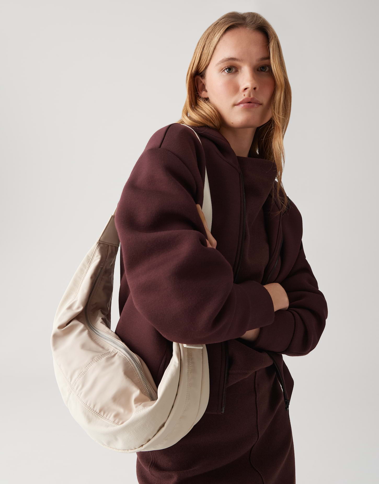 one size, Halbmond-Form, Maße: ca. 18,5 x 52 x 10 cm, Webware, Futter: Polyester, glatter Griff, dezenter Schimmer, Reißverschluss, metallische Schnalle, abgesteppte Teilungsnähte, Reißverschlussfach innen, verstellbarer Schultergurt