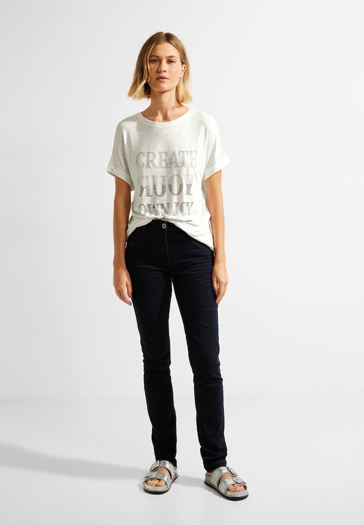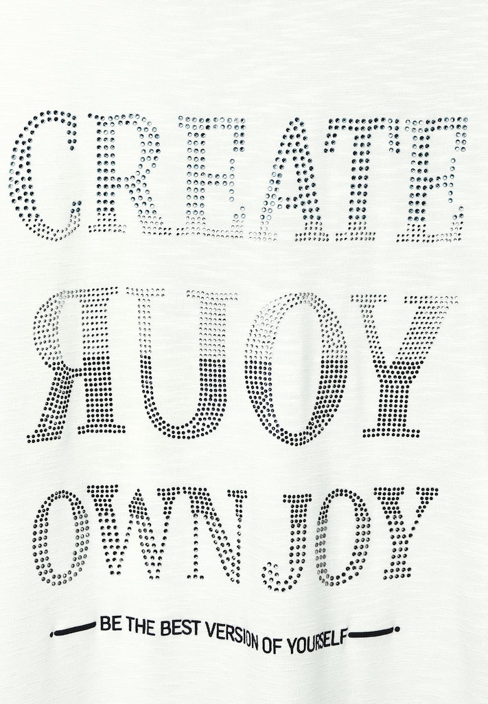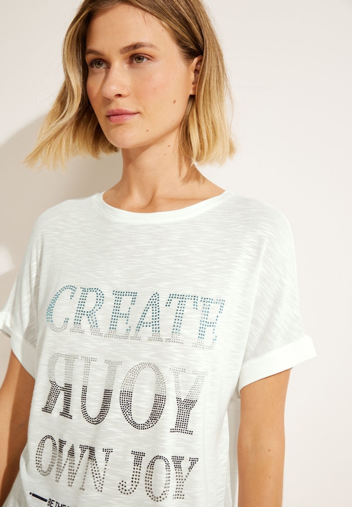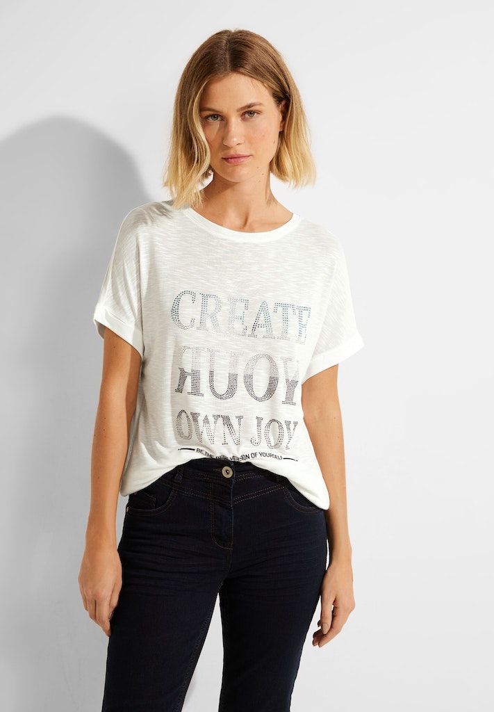 Shine on me! Das Kurzarmshirt mit Dekosteinen von CECIL ist ein modisches It-Piece. Mit Kurzarm, U-Boot Ausschnitt und einem Wording Frontprint aus Steinchen ist es ein Hingucker. Aus zarter Viskose, verleiht das Shirt ein angenehmes Tragegefühl. Es besitzt zudem eine Flammgarn Optik für einen besonderen Look. Das Shirt ist hinten etwas länger geschnitten und verfügt über seitliche Schlitze im Saum, was für eine lässige Passform sorgt.