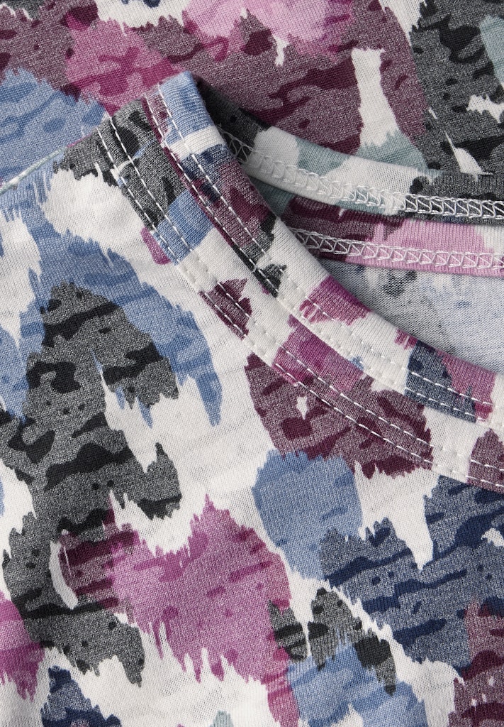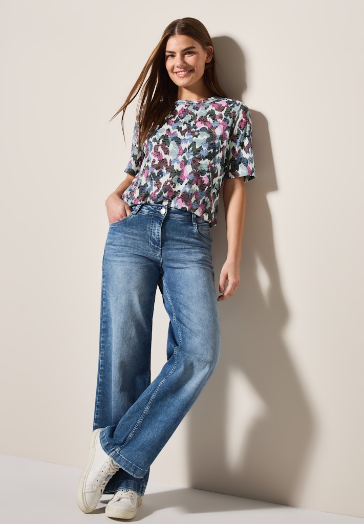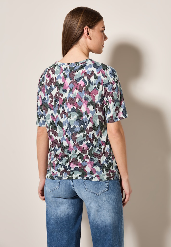 Dieses gemusterte T-Shirt von CECIL für Damen begeistert mit seiner modischen Ausbrenner-Optik. Der Rundhalsausschnitt und die kurzen Ärmel verleihen ihm eine klassische Note, während das grafische Muster für einen besonderen Hingucker sorgt. Luftig, leicht und perfekt für sommerliche Outfits. Gemustertes T-Shirt Rundhalsausschnitt Kurzarm Grafisches Muster Ausbrenner-Optik Material: 65% Polyester, 35% Viskose
