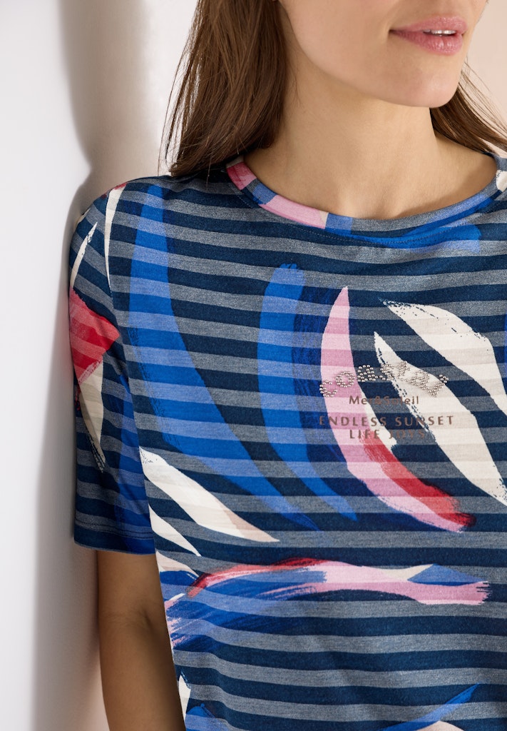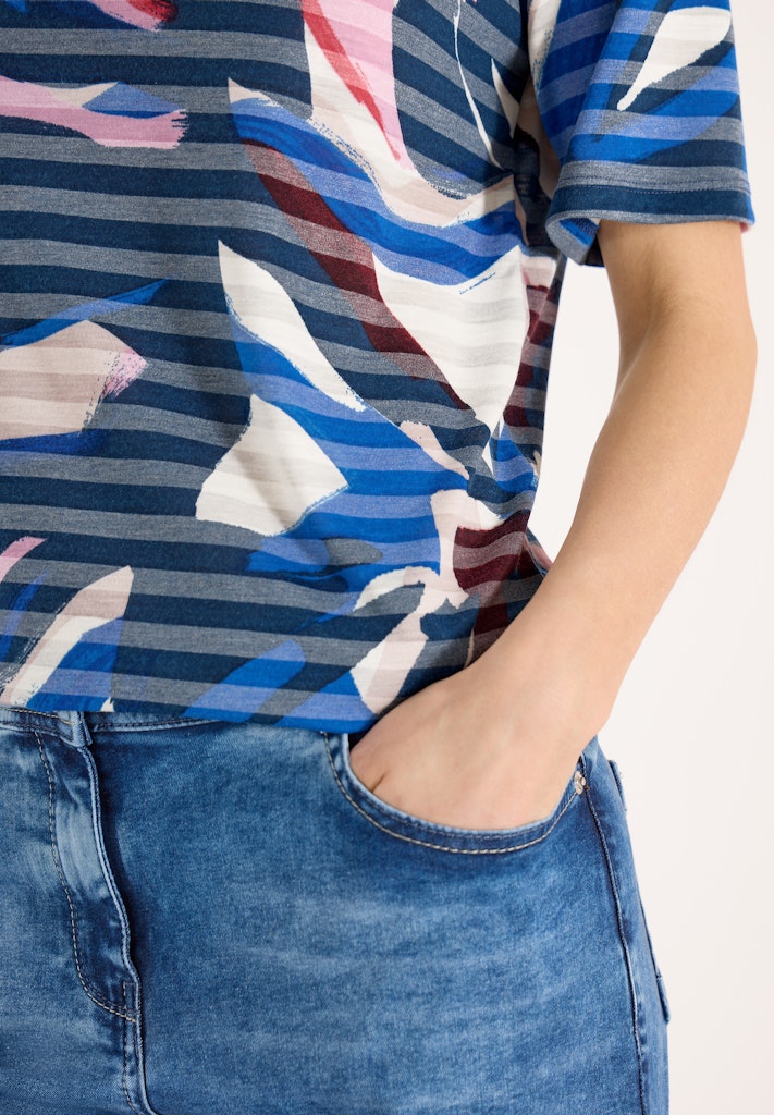 Das leichte Jerseyshirt von CECIL für Damen überzeugt mit einem Multicolor Muster und Streifen in Ausbrenner-Optik. Der U-Boot-Ausschnitt und die kurzen Ärmel sorgen für einen entspannten Casual-Look. Dank elastischem Saum sitzt das Shirt bequem und fällt weich. Ideal für dich, wenn du ein luftiges Shirt für sommerliche Outfits suchst. Leichtes Jerseyshirt Casual U-Boot-Ausschnitt Kurzarm Multicolor Muster mit Streifen in Ausbrenner-Optik Material: 65% Polyester, 35% Viskose