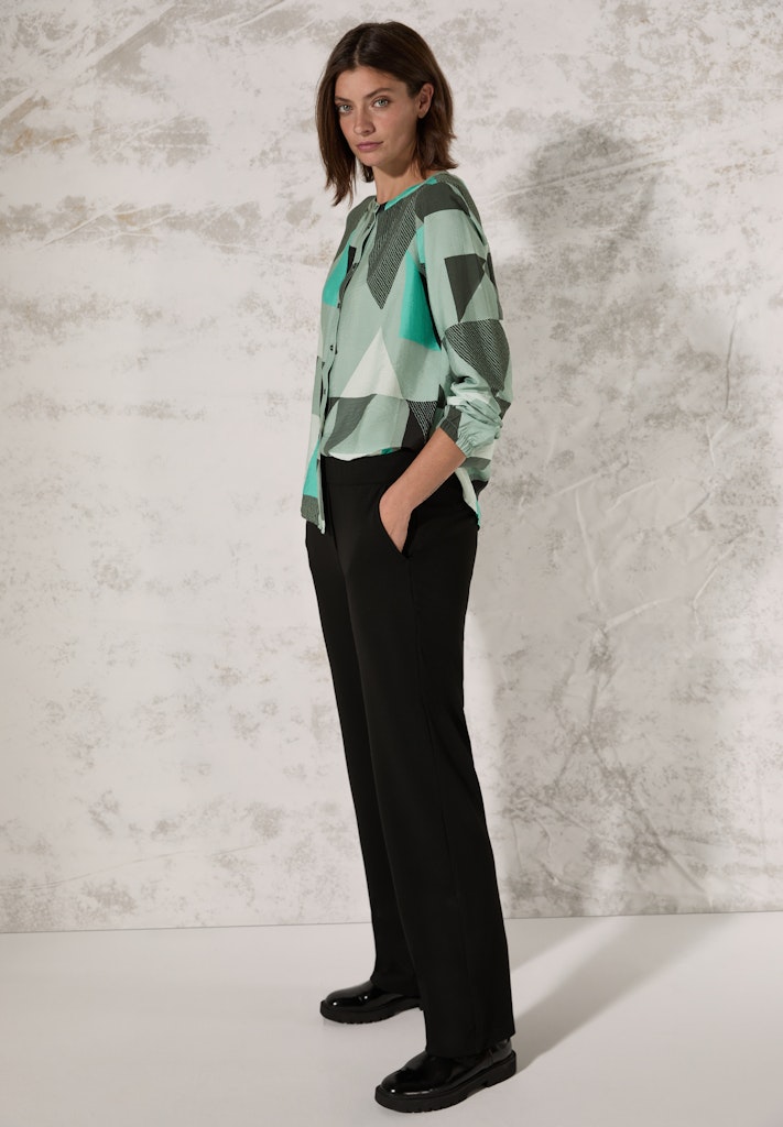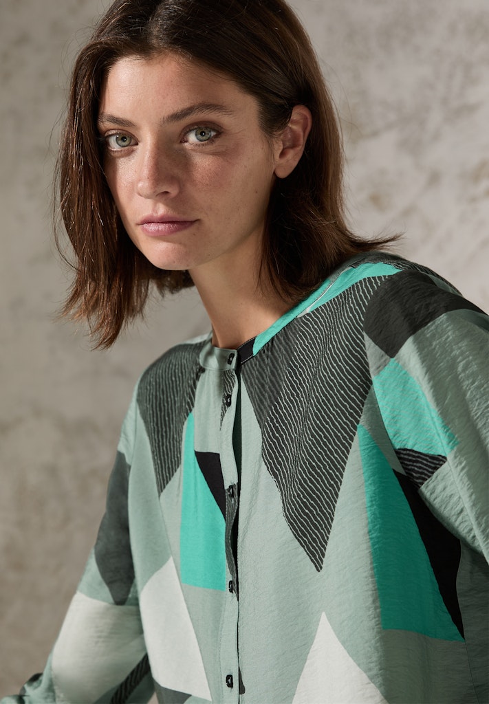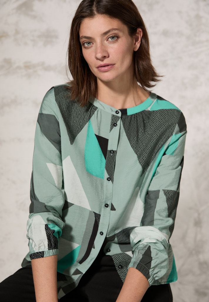 Die grafisch gemusterte Bluse von CECIL für Damen punktet mit einem Rundhalsausschnitt sowie langen Ärmeln mit Bündchen. Der angenehme Viskose-Mix sorgt für optimalen Tragekomfort und der gerundete Saum rundet den Look perfekt ab. Damenbluse mit Rundhals Knopfleiste Langarm mit elastischem Bündchen Geometrischer Print Angenehmer Viskose-Mix Material: 88% Viskose, 12% Nylon