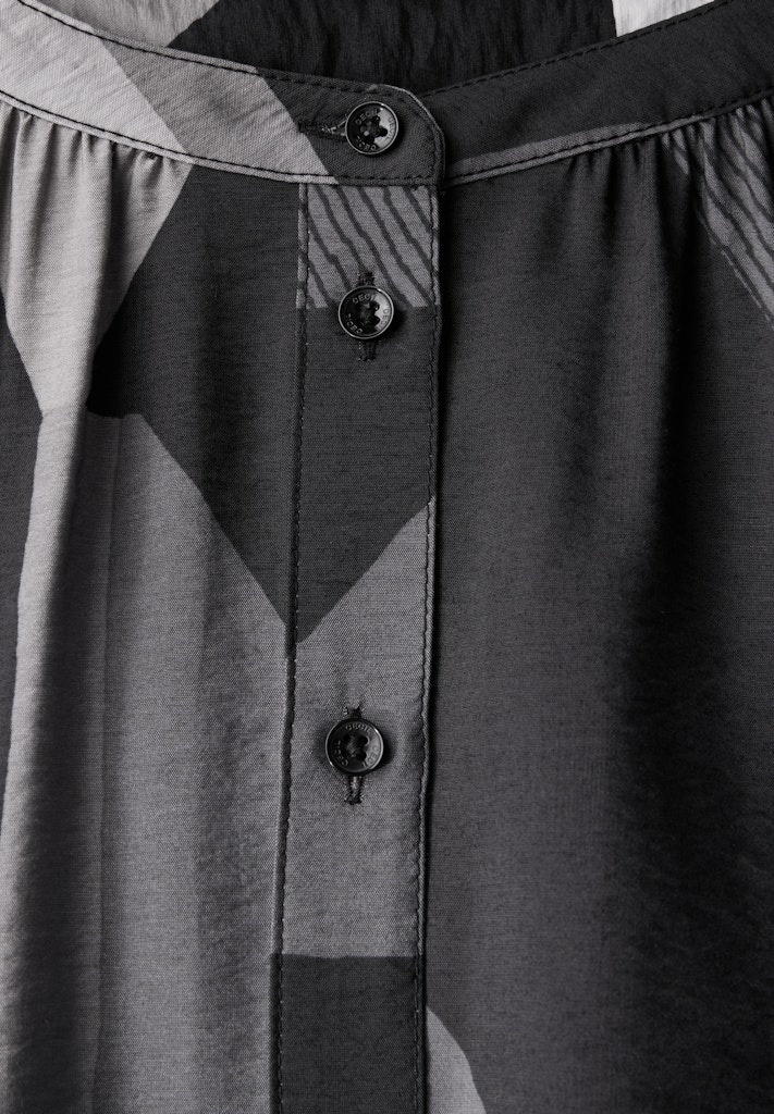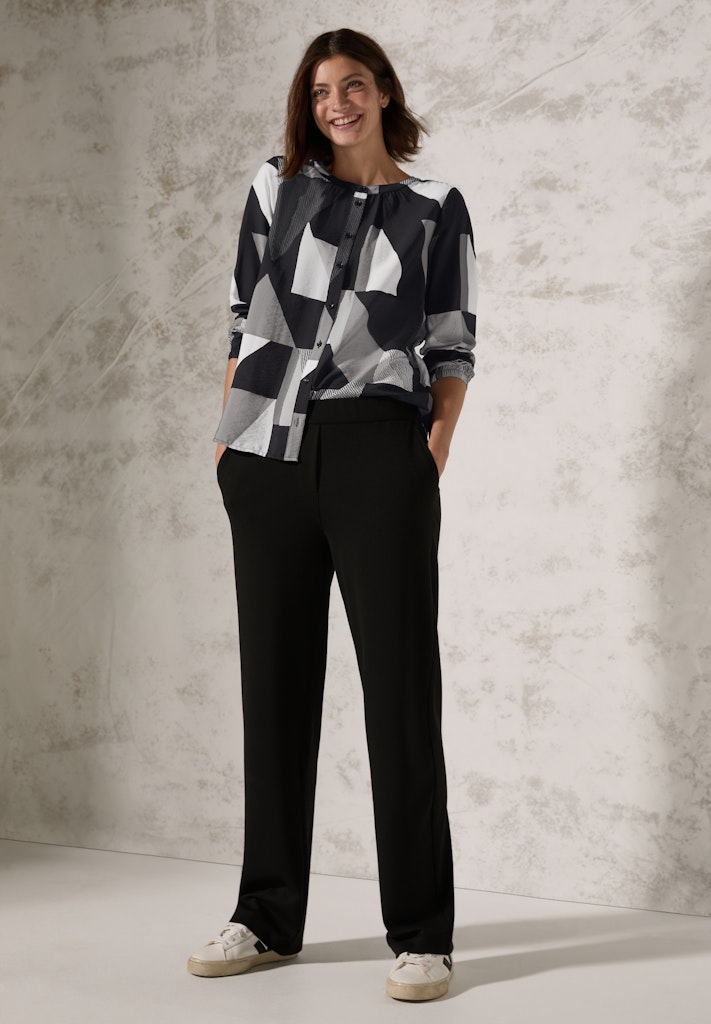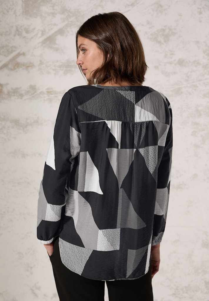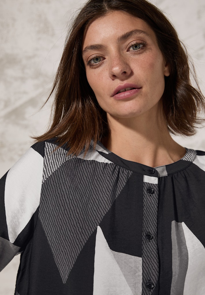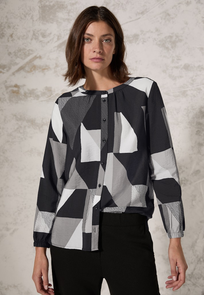 Die grafisch gemusterte Bluse von CECIL für Damen punktet mit einem Rundhalsausschnitt sowie langen Ärmeln mit Bündchen. Der angenehme Viskose-Mix sorgt für optimalen Tragekomfort und der gerundete Saum rundet den Look perfekt ab. Damenbluse mit Rundhals Knopfleiste Langarm mit elastischem Bündchen Geometrischer Print Angenehmer Viskose-Mix Material: 88% Viskose, 12% Nylon