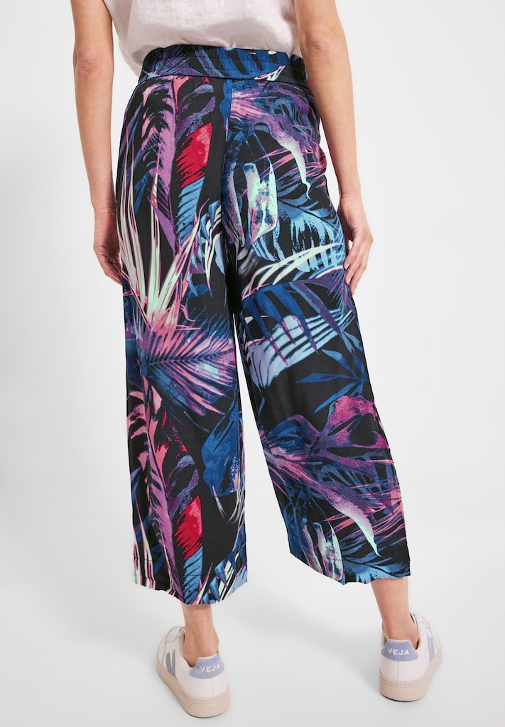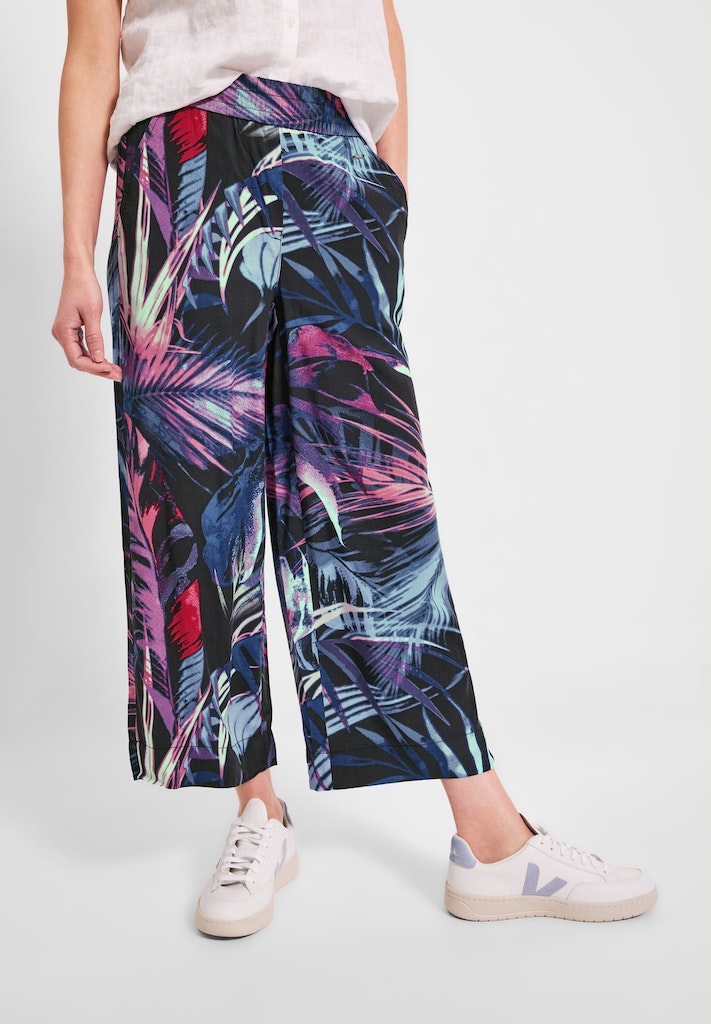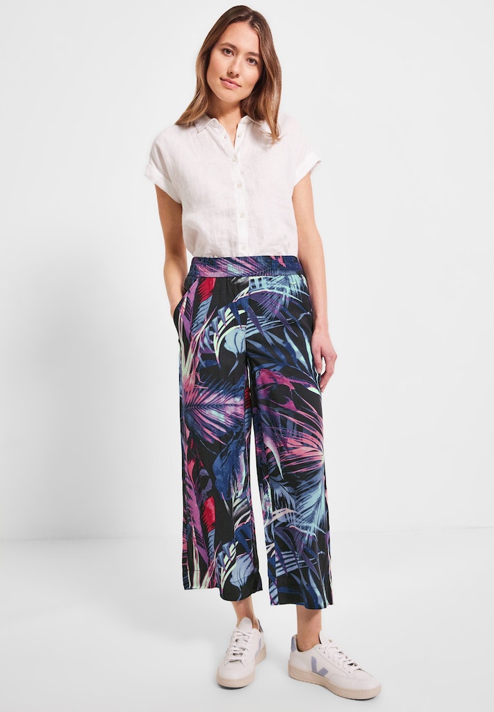 Be happy! Lässige Casual Fit Damenhose im Style Neele von CECIL, die ready for summer ist. Mit farbenfrohem Blättermuster ist sie ein Hingucker! In High Waist und mit Wide Legs setzt sie auf einen legeren Fit. Die Eingrifftaschen und der Elastiksaum runden den Style gekonnt ab. Casual Fit Hose High Waist Wide Legs Blättermuster Elastiksaum Material: 100% Viskose