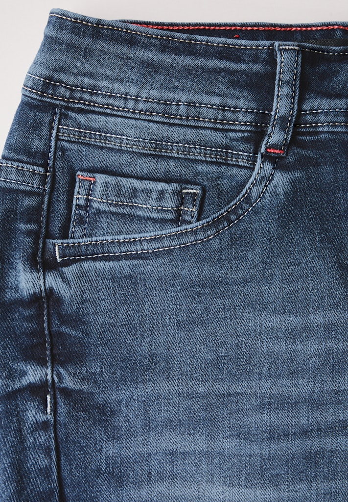 Diese Casual Fit Jeans von CECIL für Damen hat eine Mid Waist und Slim Legs für eine moderne Silhouette sowie eine bequeme Passform. Die blaue Denim Waschung verleiht der Jeanshose modisches Flair, während der Baumwollmix mit Stretchanteil für hohen Tragekomfort sorgt. Jeanshose Mid Waist und Slim Legs Blaue Denim Waschung 5-Pocket Baumwollmix mit Stretchanteil Material: 78% Baumwolle, 20% Polyester, 2% Elasthan