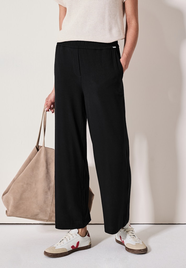 Die Jersey-Hose von CECIL für Damen kombiniert eine lockere Wide Leg Passform mit hohem Tragekomfort. Die High-Waist-Silhouette und der elastische Bund sorgen für einen entspannten Sitz. Der weiche Viskosemix mit Stretchanteil macht sie ideal für gemütliche Alltagslooks. Culotte im Loose Fit High Waist und Wide Legs Seitliche Taschen Elastischer Bund Viskosemix mit Stretchanteil Material: 95% Viskose, 5% Elasthan
