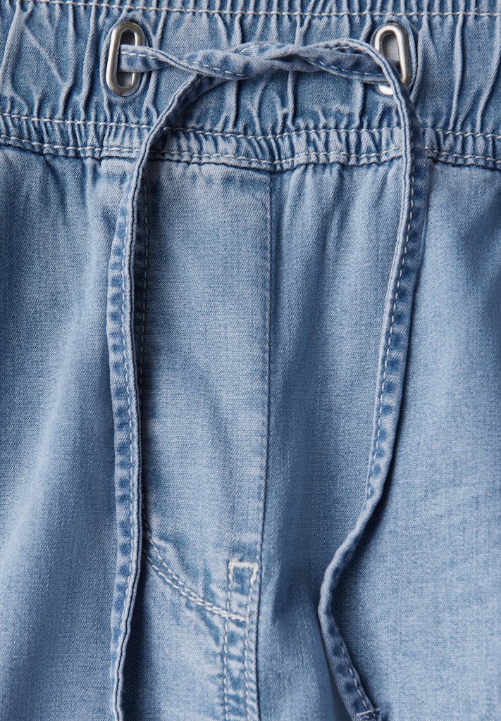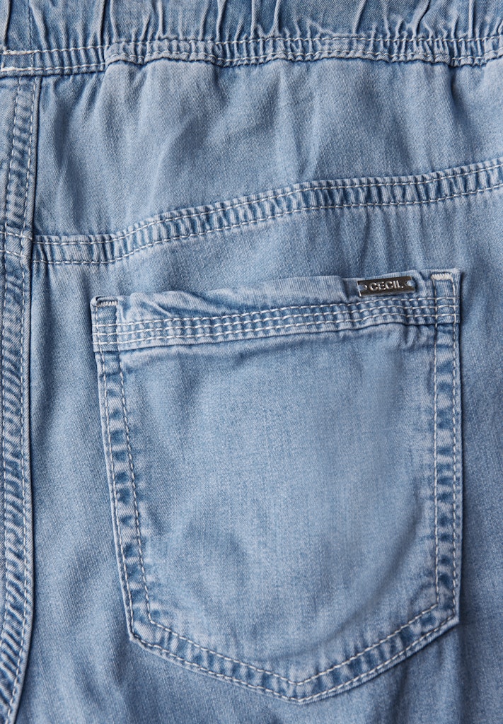 Diese Wide Leg Jeans im Style Neele von CECIL für Damen setzt mit ihrem elastischen Bund mit Tunnelzug lässige Akzente. Die Lyocellqualität mit Stretchanteil und ein gemütlicher Loose Fit sorgt für hohen Tragekomfort, während die High Waist und seitliche taschen den Look abrunden. Ihre blaue Waschung macht die Jeanshose vielseitig kombinierbar. Ein gemütlicher Allrounder für deine Sommerlooks. Jeanshose im Loose Fit High Waist und Wide Legs Elastischer Bund mit Tunnelzug Blaue Waschung Lyocellmix mit Stretchanteil Material: 97% Lyocell, 3% Elasthan