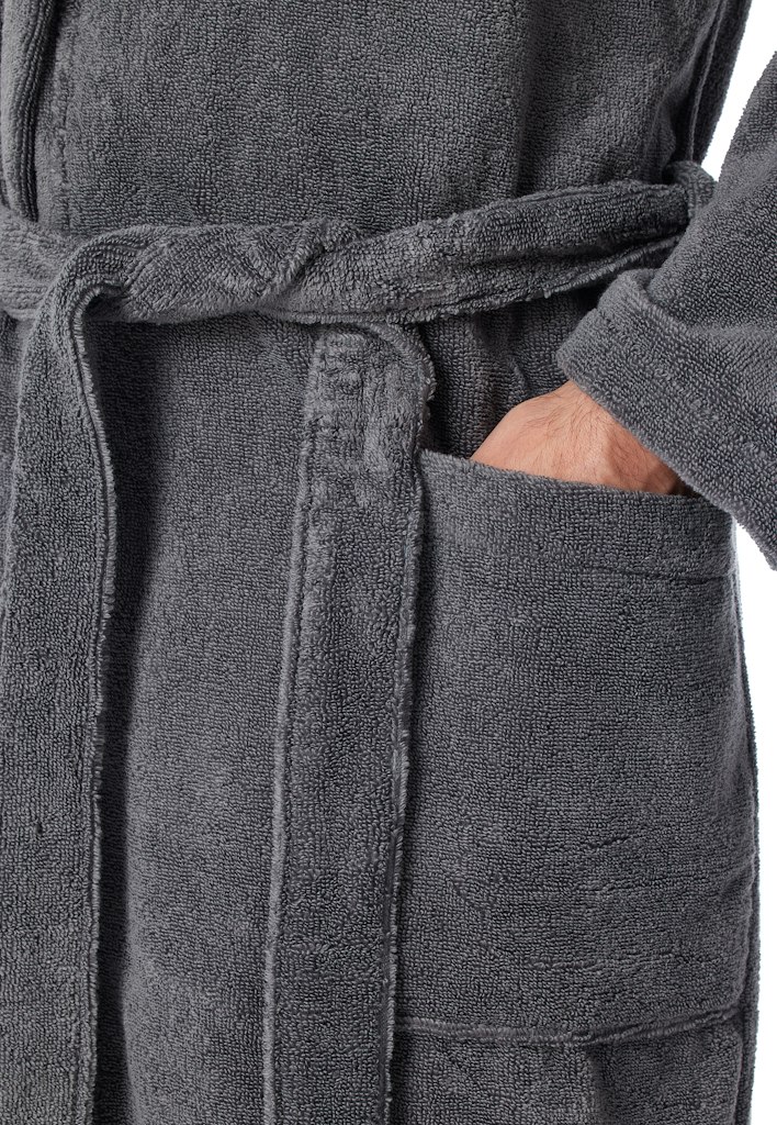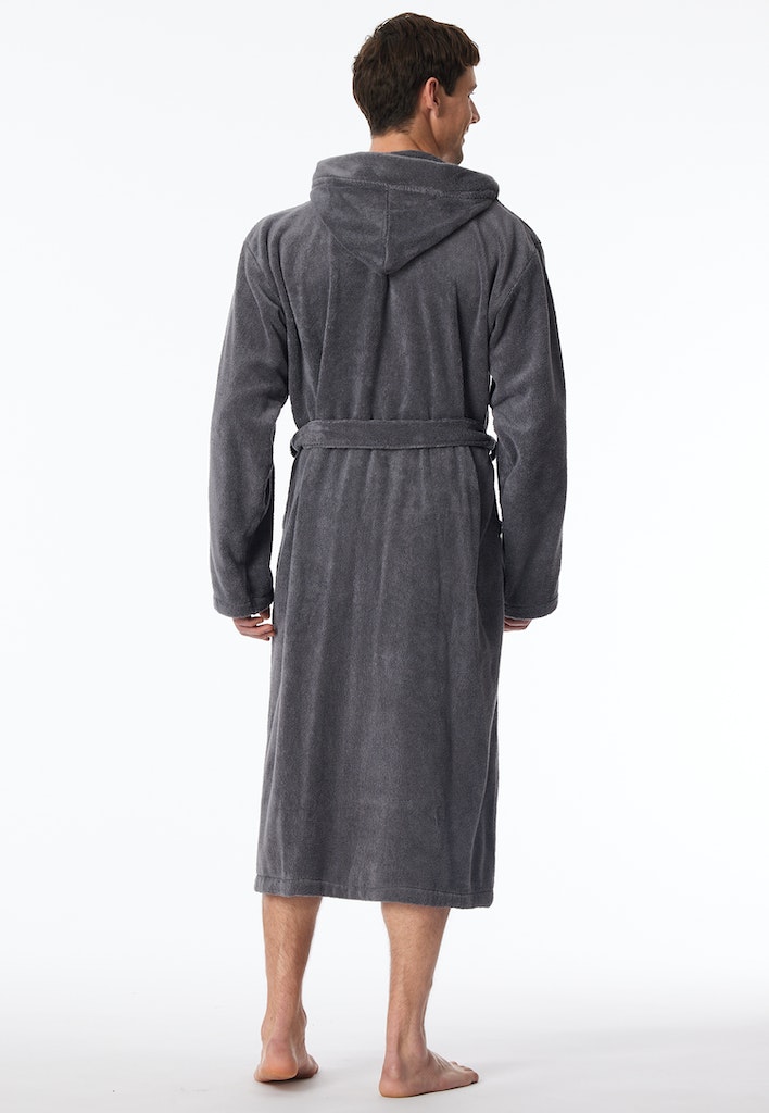 Dieser graue Bademantel schmeichelt anspruchsvollen Herren mit einem angenehm soften Material in bester SCHIESSER-Qualität. Hochwertiger Frottee aus 100% Baumwolle spendet dabei ein behagliches Gefühl auf der Haut und erhält mit der großen Kapuze, einem Bindegürtel und zwei aufgesetzten Taschen stimmige Details. Der perfekte Begleiter nach einem entspannten Vollbad, dem Sauna-Gang oder zum duftenden Kaffee und Tageszeitung am Morgen!
