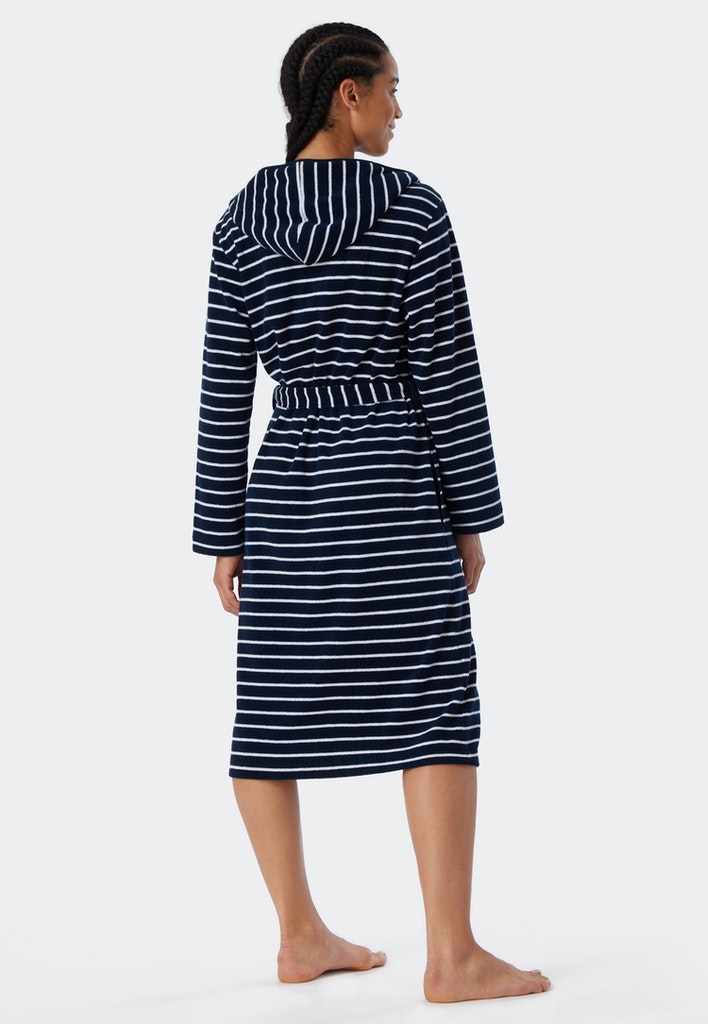 Dieser Bademantel für Damen ist flauschig-weich und dabei sehr leicht. Sein Leichtfrottee mit hohem Anteil an Bio-Baumwolle schmeichelt außerdem der Haut; die große Kapuze, seitliche Eingrifftaschen und der höhenvariable Gürtel sind zusätzlich praktische Details. Sein geringes Gewicht macht ihn ideal für unterwegs, doch er eignet sich ebenso für den täglichen Gebrauch im eigenen Bad.