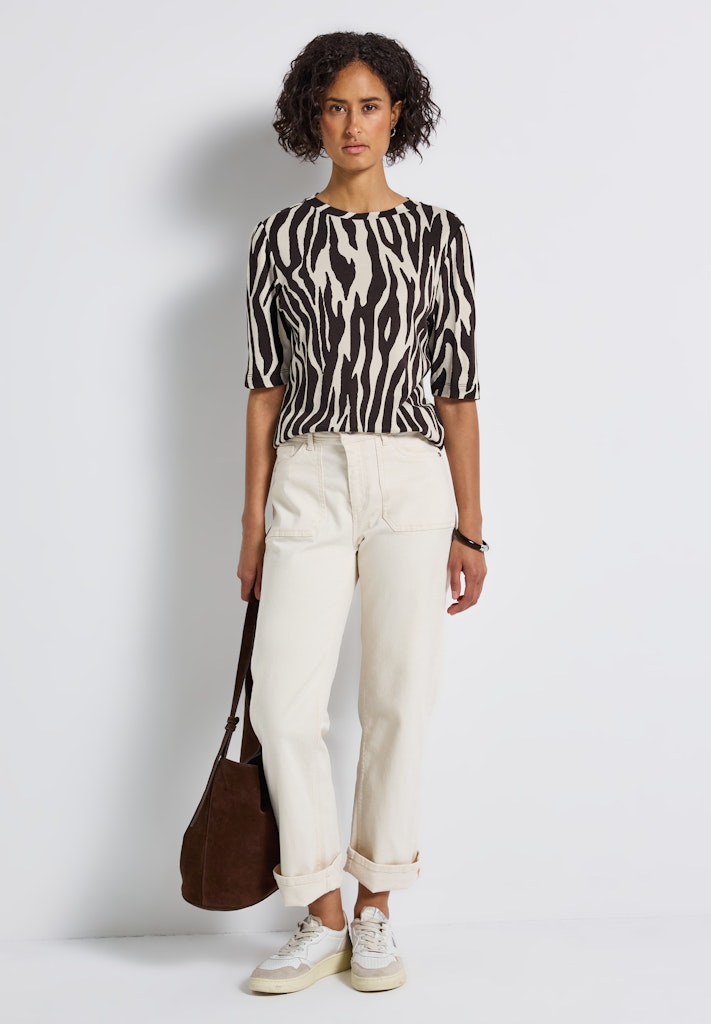Dieses Basic T-Shirt von Street One für Damen bringt mit der feinen Schulterraffung eine feminine Note in dein Outfit. Der Rundhalsausschnitt und der weiche Baumwoll-Modalmix bieten dir dabei optimalen Tragekomfort. Ein vielseitiger Allrounder für jeden Tag. Damenshirt Rundhalsausschnitt Kurzarm Raffung an der Schulter Softer Baumwoll-Modalmix Material: 50% Baumwolle, 50% Modal