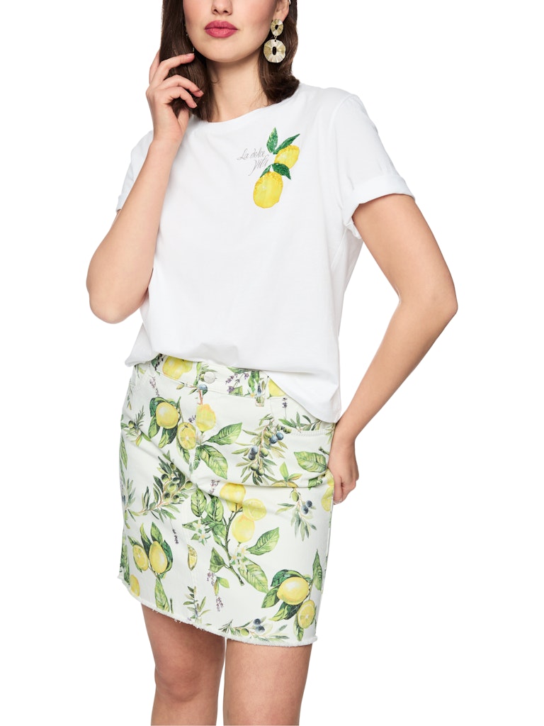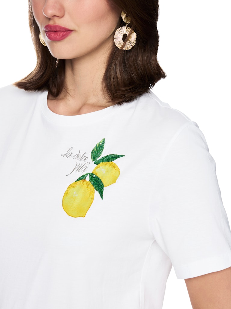 Baumwollshirt mit Zitronen|Locker geschnittenes Shirt aus 100 % Baumwolle mit angenehm weichem Tragegefühl. Der platzierte Zitronen-Print mit kleinen Pailletten und Mini-Perlen setzt einen frischen, sommerlichen Akzent und macht das Design zum Hingucker. Mit klassischem Rundhalsausschnitt und kurzen Ärmeln ist es vielseitig kombinierbar.|Locker geschnitten|Aufgedruckte Zitronen|Rundhals|Kurze Ärmel|Das Model ist 179 cm groß und trägt N3/38.