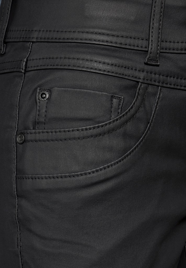 Die beschichtete Hose von CECIL für Damen ist ein modischer Hingucker. Die Damenhose im Casual Fit und 5-Pocket-Form wird durch den modischen Leder-Look zur perfekten Wahl. Damenhose im Casual Fit Mid Waist und Slim Legs Knopf und Reißverschluss 5-Pocket Modischer Leder-Look Material: 76% Viskose, 21% Nylon, 3% Elasthan