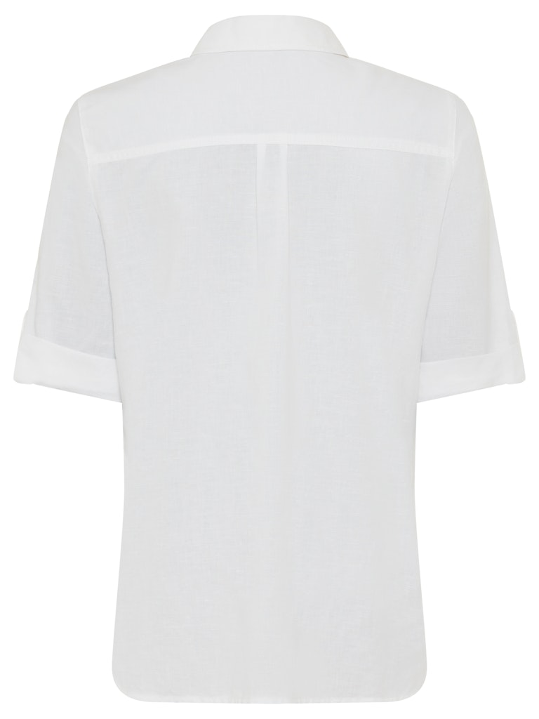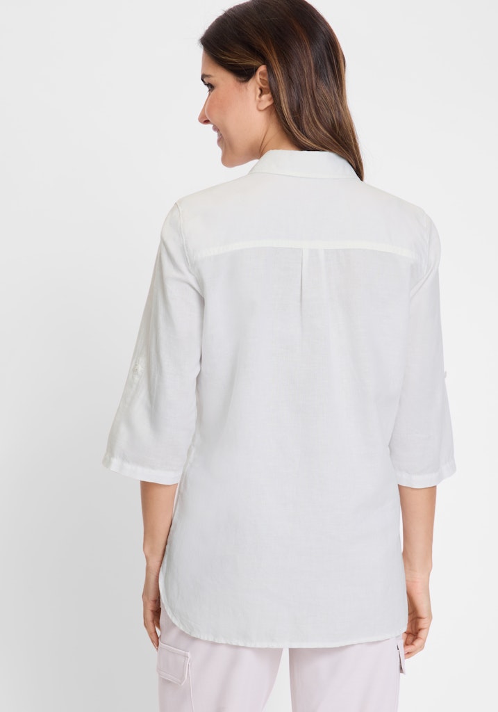 Diese Bluse mit klassischem Hemdkragen besticht durch ihre vielseitigen Details. Die Knopfleiste und zwei Brusttaschen verleihen ihr einen stilvollen, funktionalen Look. Die 1/3-Ärmel lassen sich nach Belieben krempeln und mit einem Riegel sowie Knopf fixieren, was der Bluse eine praktische und moderne Note verleiht. Gefertigt aus einer angenehmen Mischung aus Leinen und Baumwolle, sorgt sie für hohen Tragekomfort. Länge ca. 66 cm.