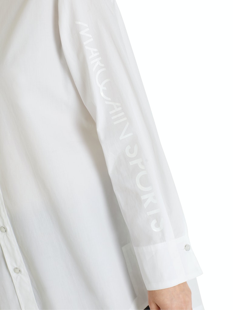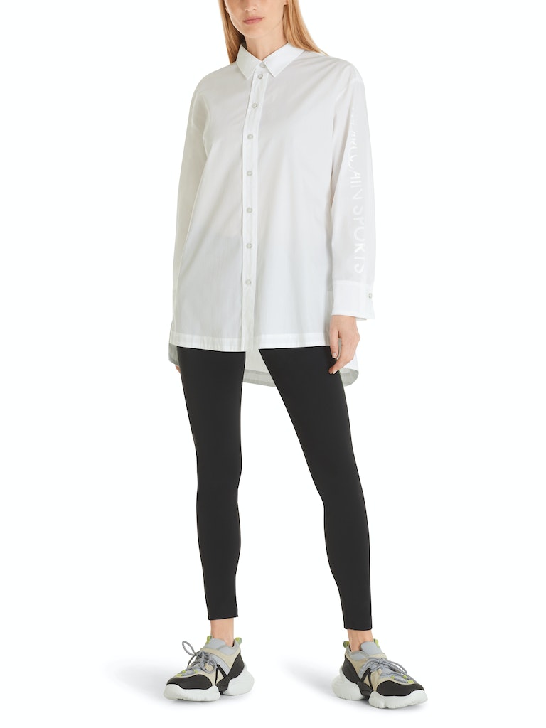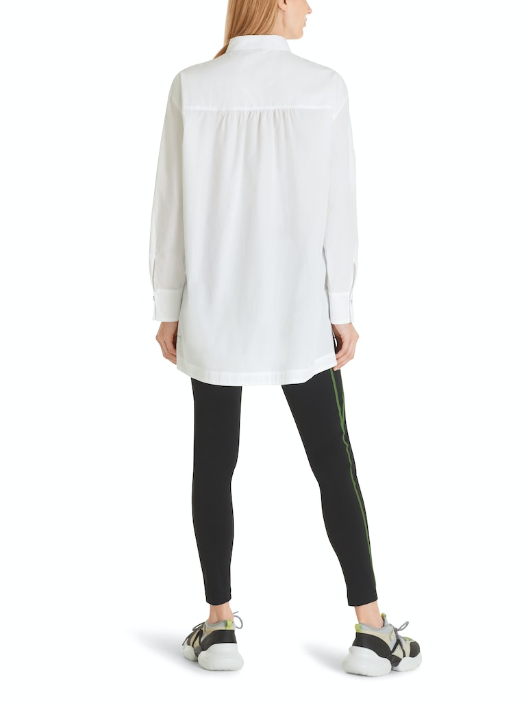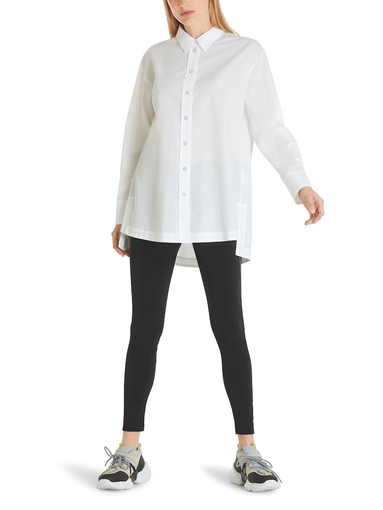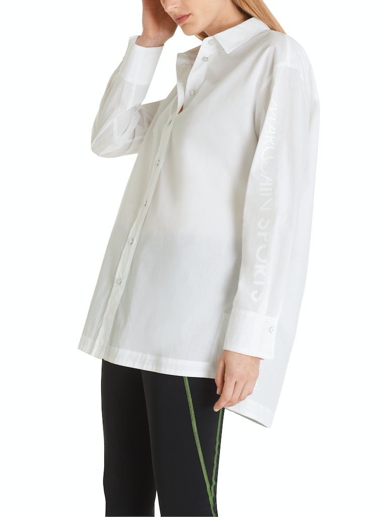 Bluse "Rethink Together"|Klassische Hemdbluse mit verlängertem Rückteil und Logo-Beschichtung am Ärmel. Das Modell mit dem Nachhaltigkeitslabel "Rethink Together" ist aus zertifizierter Bio-Baumwolle gefertigt. Diese Baumwolle wird nach strengen ökologischen Standards angebaut, einer besonders ressourcenschonenden und umweltverträglichen Form der Landwirtschaft.|Farbe: white|Locker geschnitten|Made in Europe|Das Model ist 179 cm groß und trägt N3/38.|Mit Seitenschlitzen||||