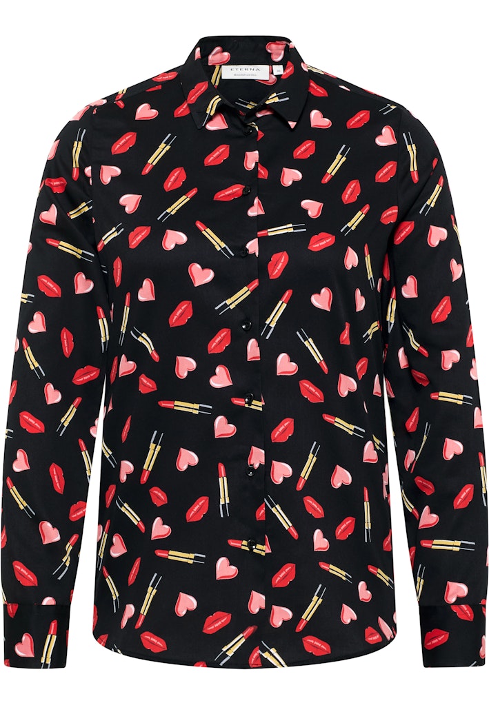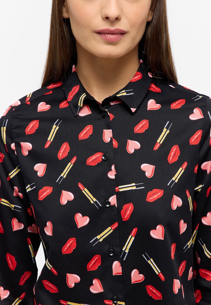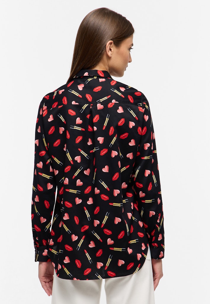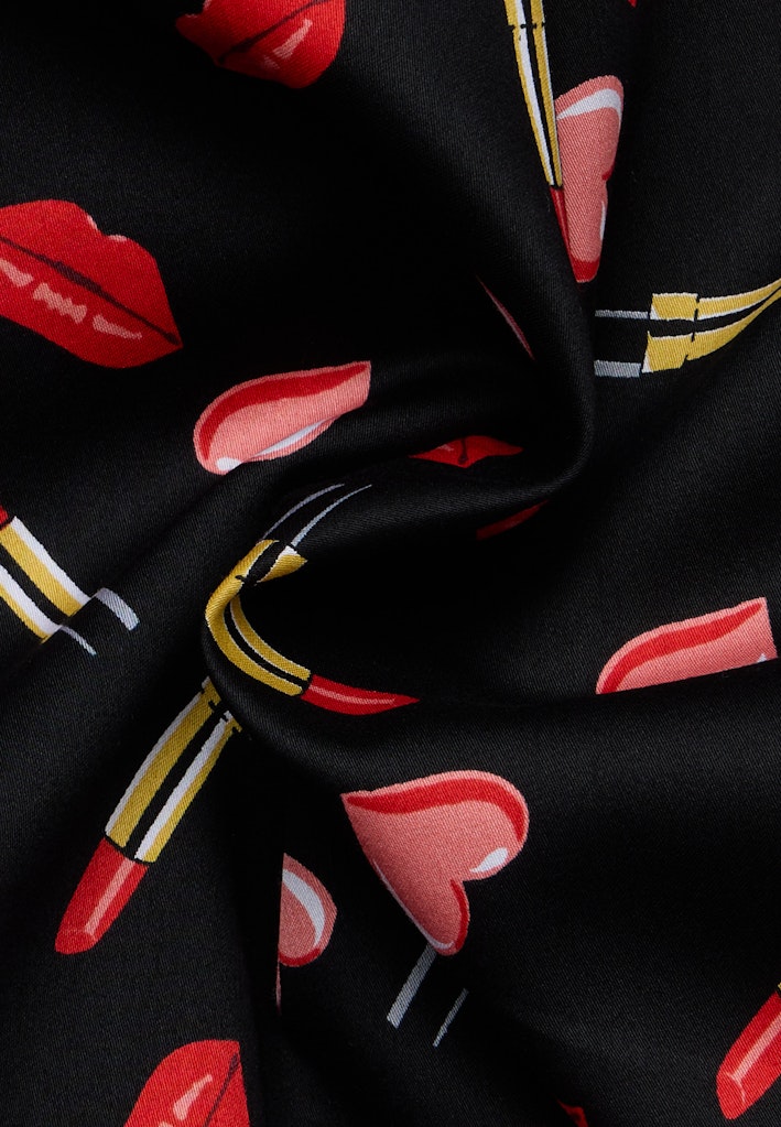 Unsere Bluse, mit auffälligem Lipstick-Print auf Cotton-Satin, kombiniert Eleganz und verspielte Details auf eine raffinierte Weise.