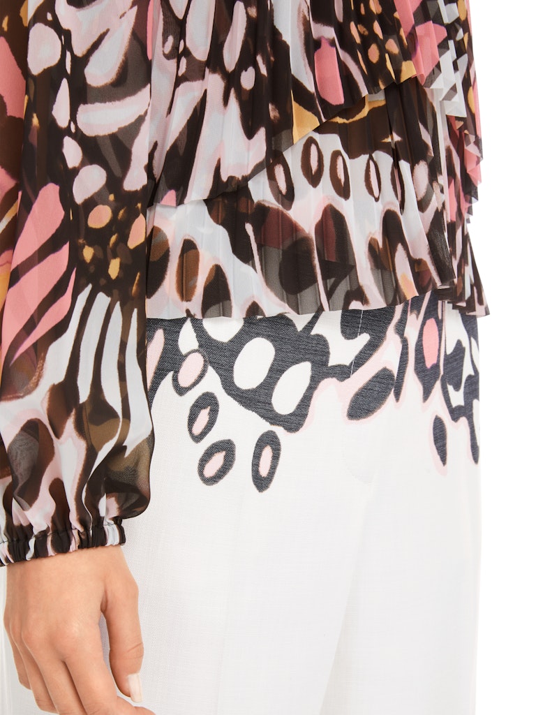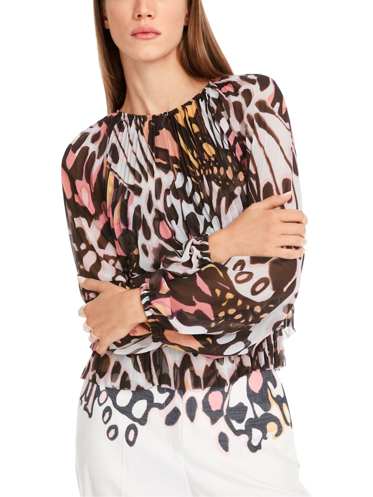 Bluse im stilisierten Butterfly-Print|Feminin präsentiert diese Bluse einen stilisierten Butterfly-Print. Ergänzt wird der Stil durch die weite Schlupfform mit abgestuftem Saum. Das fließende Material ist im Rumpf plissiert. Die Ärmel sind weit und haben elastische Abschlüsse. Ein zarter Knopfverschluss ziert den Rundhals.|Weite Schlupfform|Abgestufter Saum|Elastische Armabschlüsse|Fließendes, plissiertes Material|Das Model ist 179 cm groß und trägt N3/38.