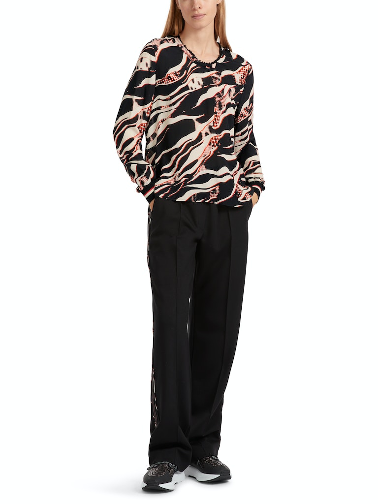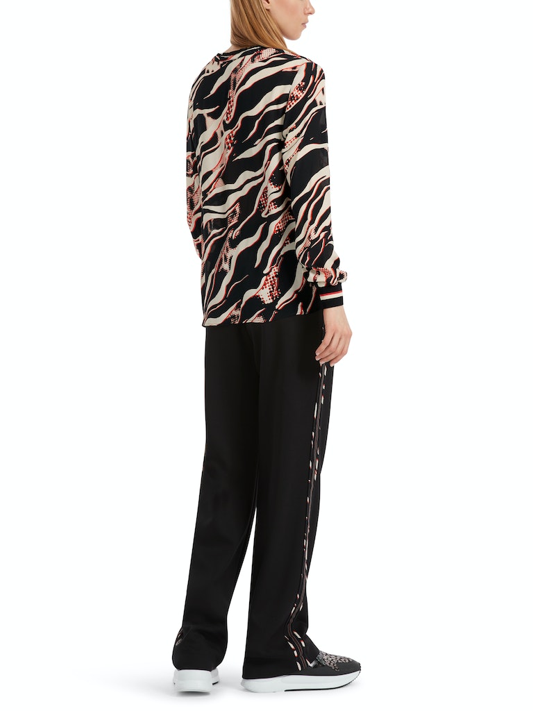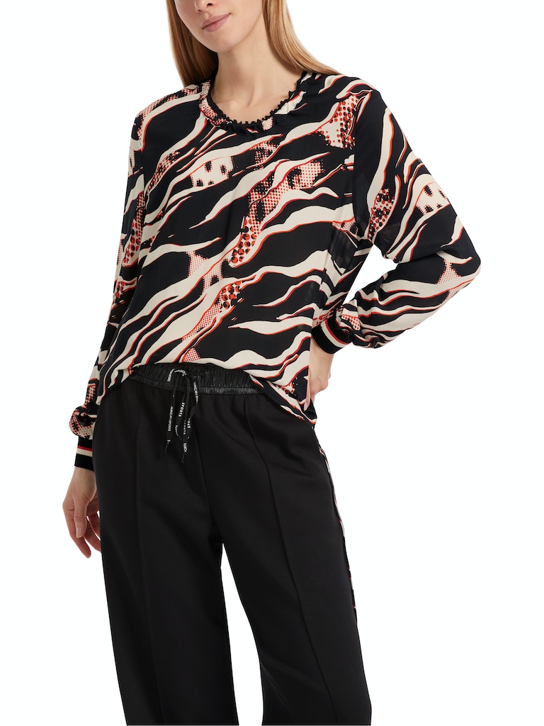 Bluse mit Allover-Print|Die Bluse ist aus reiner weichfließender Viskose. Der Schnitt ist weit und die Schultern überschnitten. Der Halsausschnitt ist gerafft und hat einen angedeuteten Volant. Der Ärmel schließt mit einem Strickbündchen ab. Der Leo-Print wirkt durch die die partiell grobpixelige Auflösung und die Farbgebung.|Farbe: campari|A-Linie|Made in Europe|Das Model ist 179 cm groß und trägt N3/38.|Seitenschlitze||||