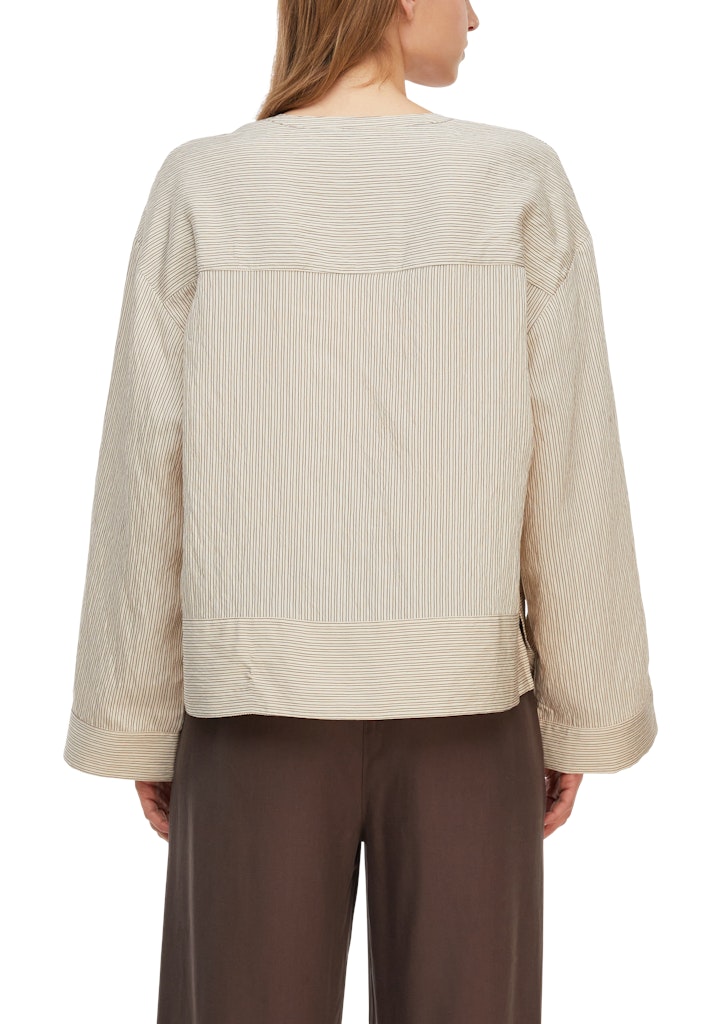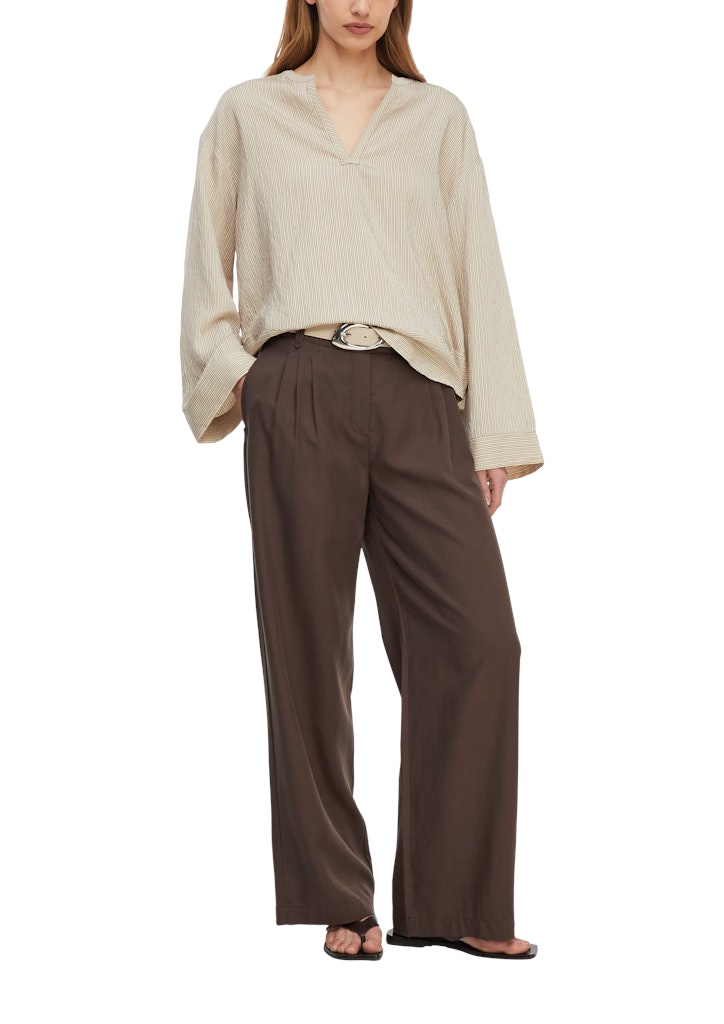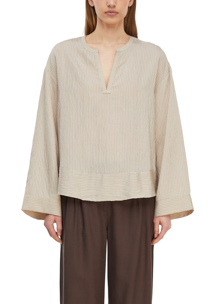 Entdecken Sie diese leichte Viskosemix-Tunika mit feinen Streifen, die Ihrem Look eine zeitlose Eleganz verleiht. Der Tunika-Ausschnitt und die Loose Fit-Passform sorgen für angenehme Bewegungsfreiheit und lässigen Komfort. Die langen Ärmel machen diese Bluse zum perfekten Begleiter für kühlere Tage. Kombinieren Sie sie zur Jeans für einen entspannten Alltags-Look oder stylen Sie sie mit einer eleganten Hose fürs Büro.