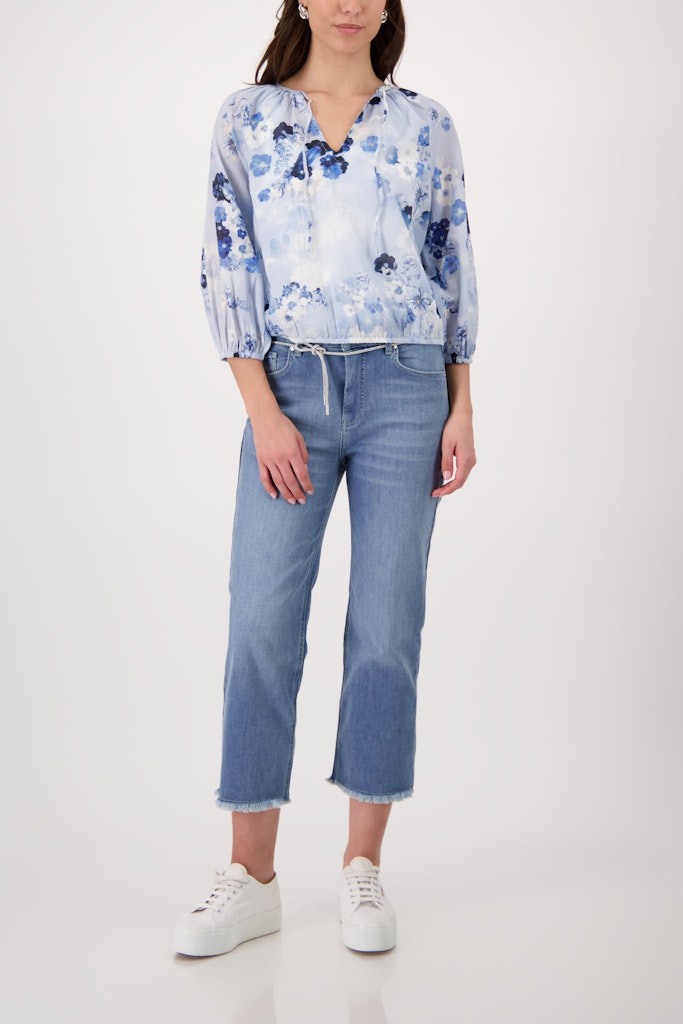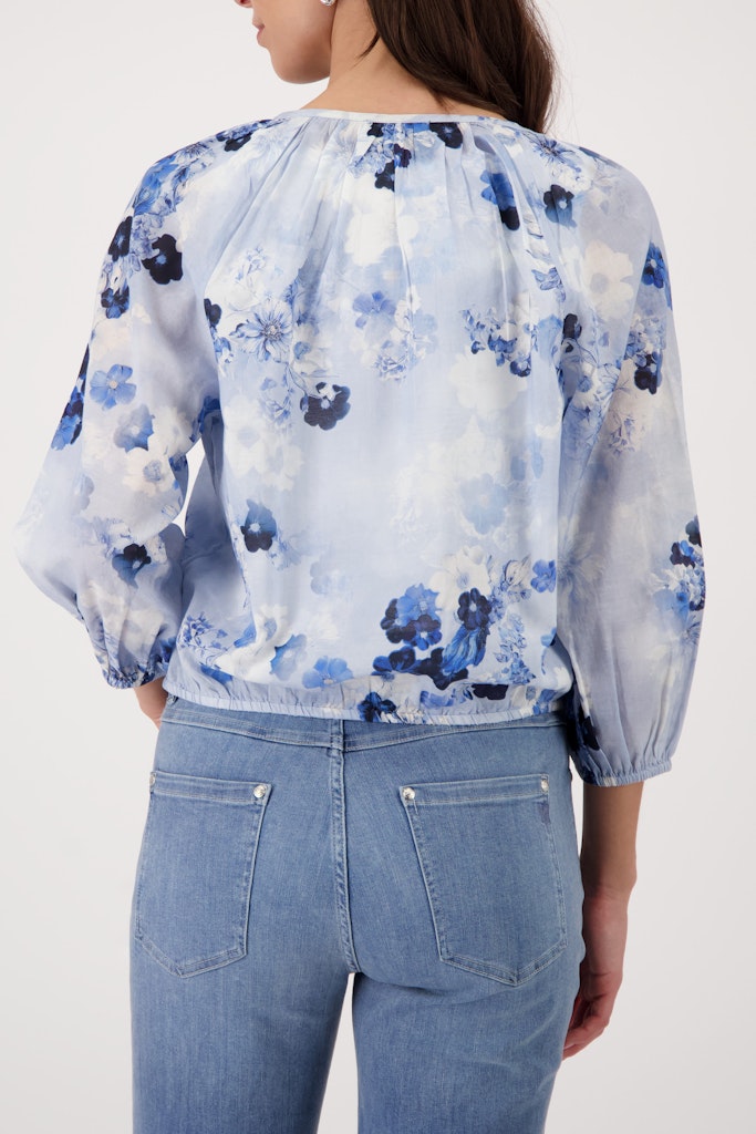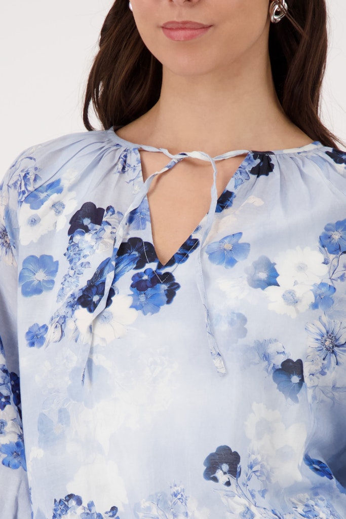 Elegante Bluse aus hochwertiger Baumwolle und fließender Viskose, verziert mit einem floralen Muster und verspielten Kräuseldetails.
