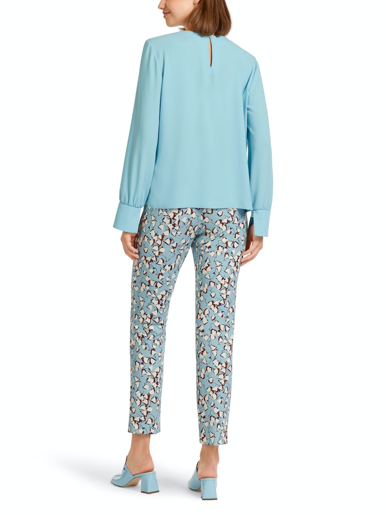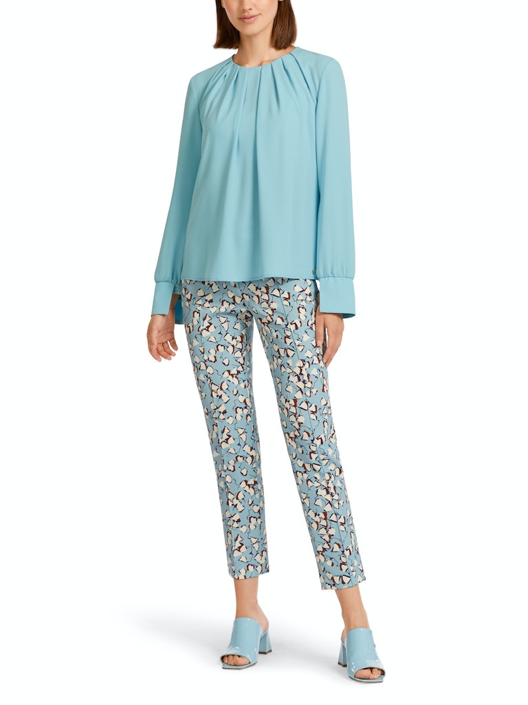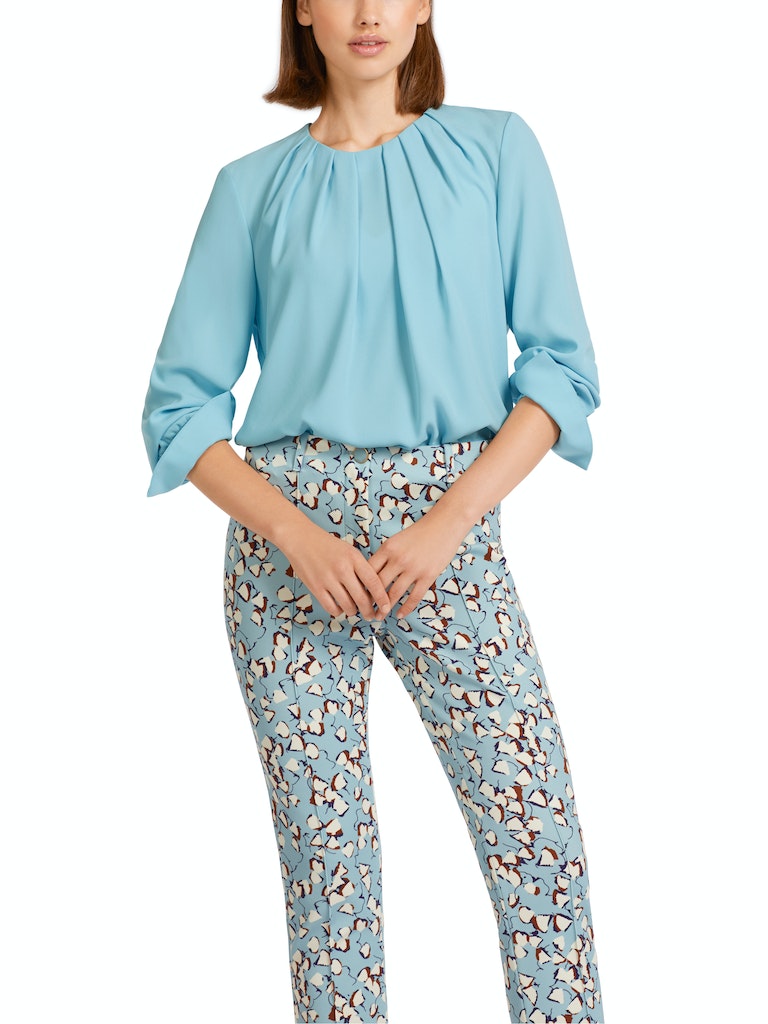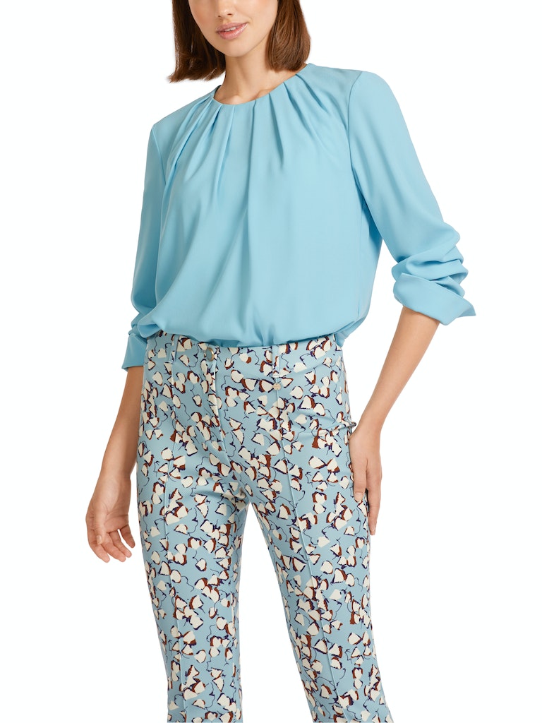 Blusenshirt mit Falten|Extravagantes Blusenshirt aus weich fließendem Triacetat mit Polyester. Der Rundhalsausschnitt mit Falten zieht bei dieser Bluse die Blicke an. Außergewöhnlich zeigen sich auch die weiten Ärmel mit elastischen Bündchen und aufgesetzten Manschetten. Ein zarter Knopfverschluss im Nacken rundet das Design stilvoll ab.|Farbe: atmospheric blue|Weite Silhouette|Made in Europe|Das Model ist 179 cm groß und trägt N3/38.|Mit Bündchen- und Manschettenärmeln||||