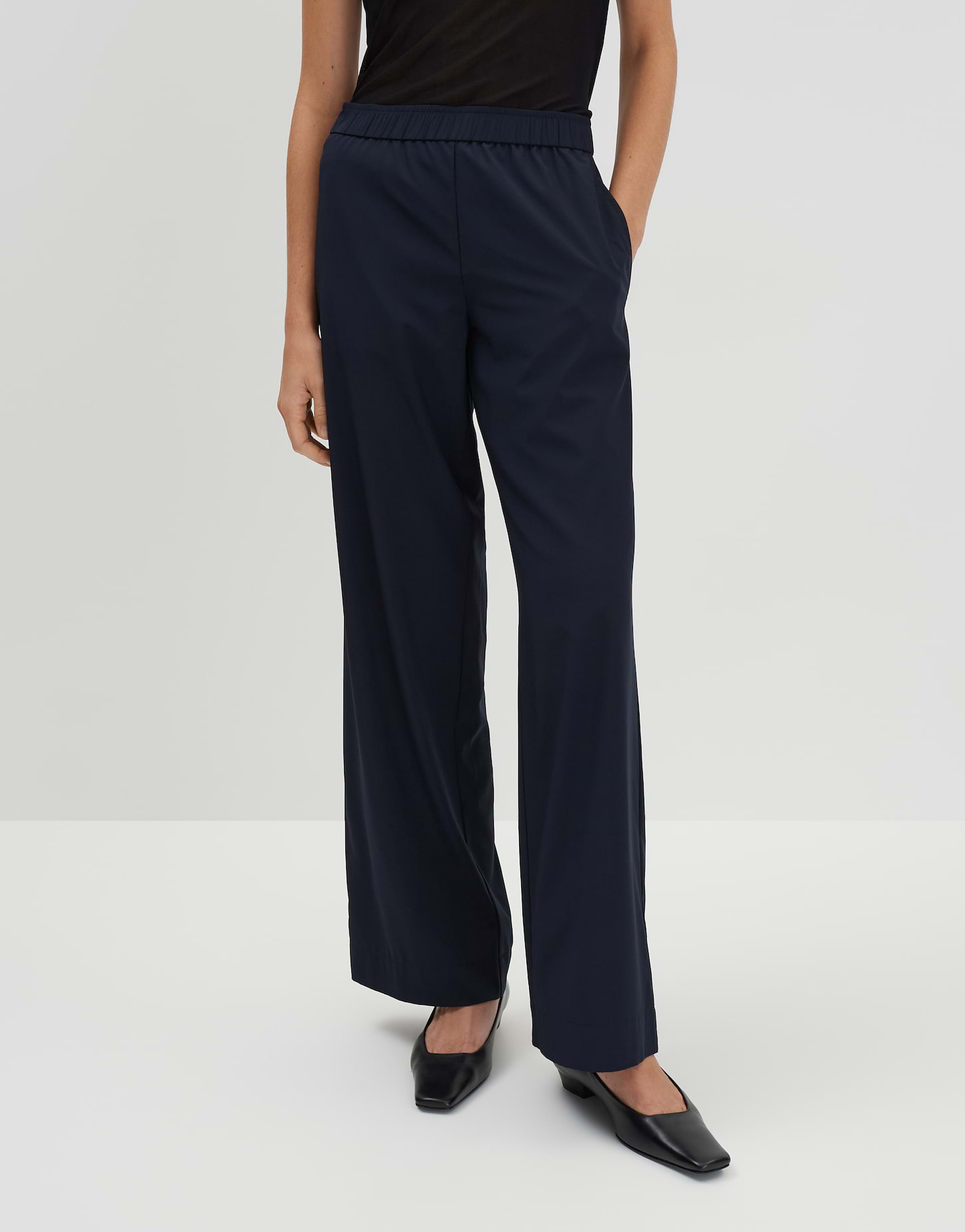 weit am Oberschenkel, weiter, gerader Beinverlauf, Hosenbein Innenlänge ca. 79 cm in jeder Größe, Model Größe 177 cm - trägt Größe 36, Webware, leichter Stoff, pflegeleicht, knitterarm, französische Taschen in den Seiten, elastischer Gummibund