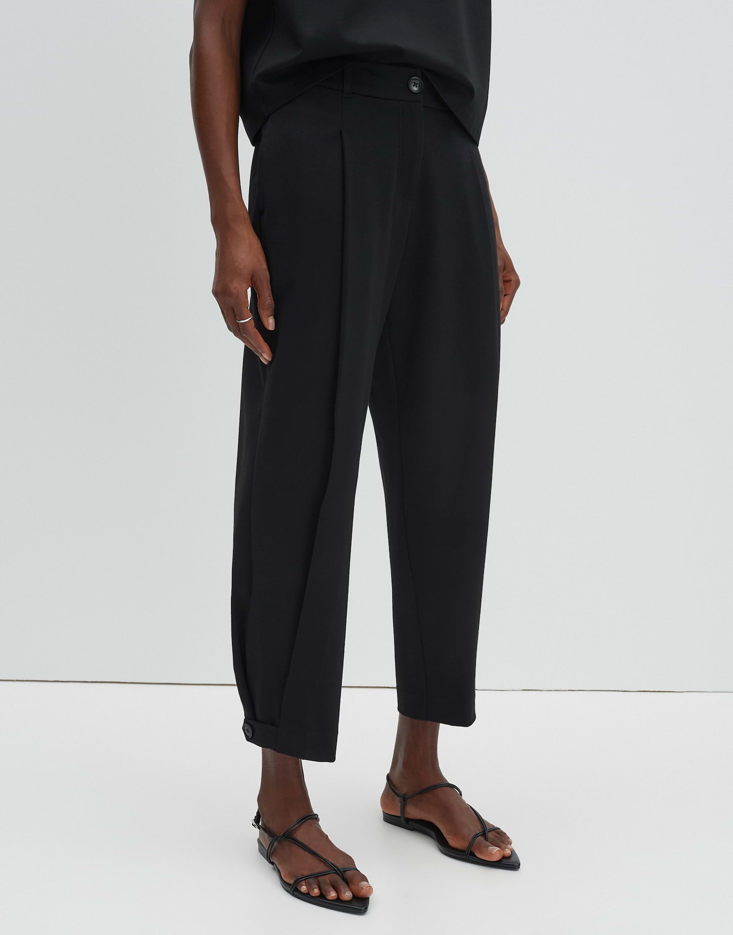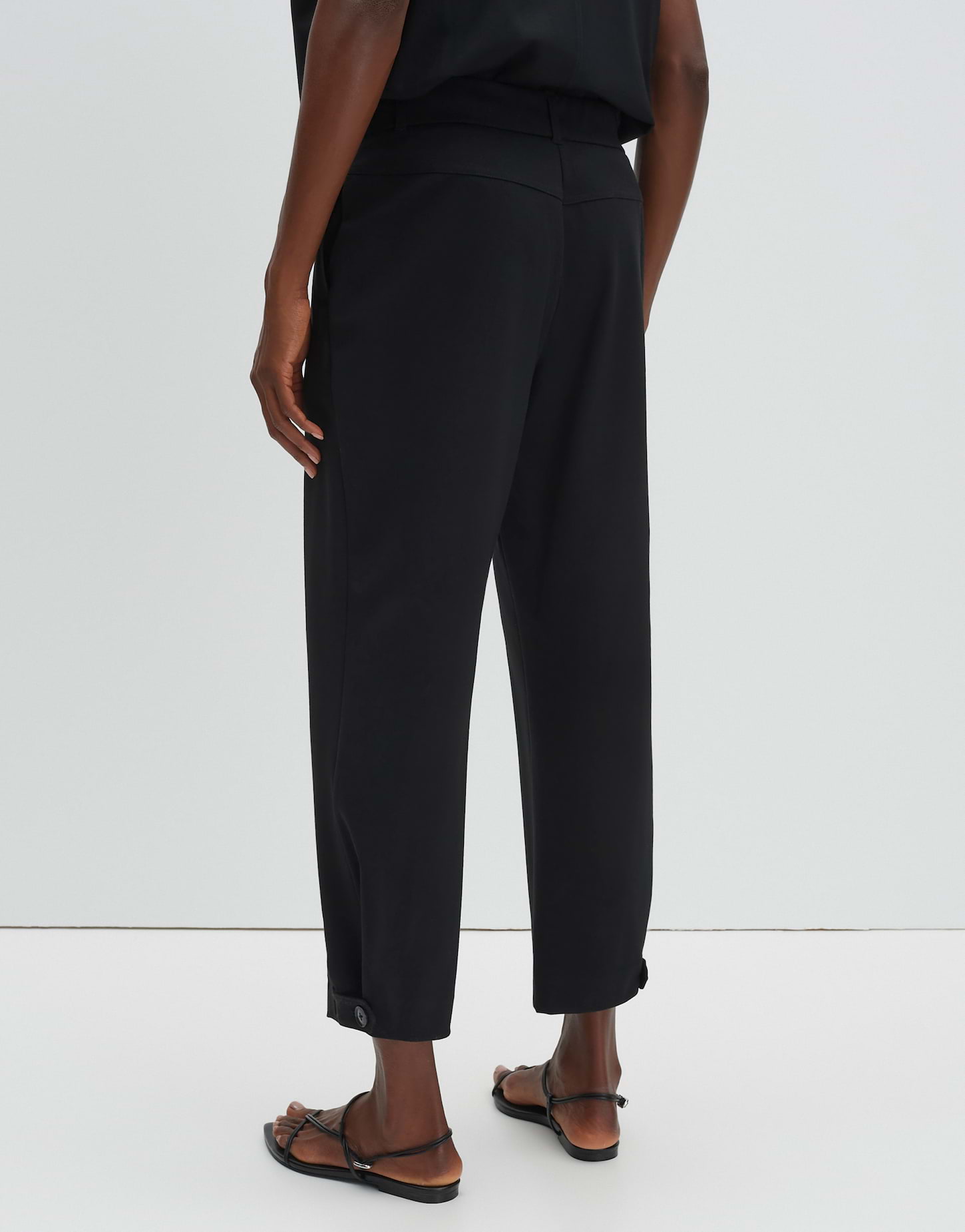 ovaler Beinverlauf, Hosenbein Innenlänge ca. 68 cm in jeder Größe, Model Größe 176 cm - trägt Größe 36, Webware, fester Griff, weich fließender Fall, knitterarm, Nahttaschen in der Seitennaht, Bundfalten, Bügelfalten, Riegel mit Knopf am Saum, verdeckter Zip-Fly, elastischer Gummibund