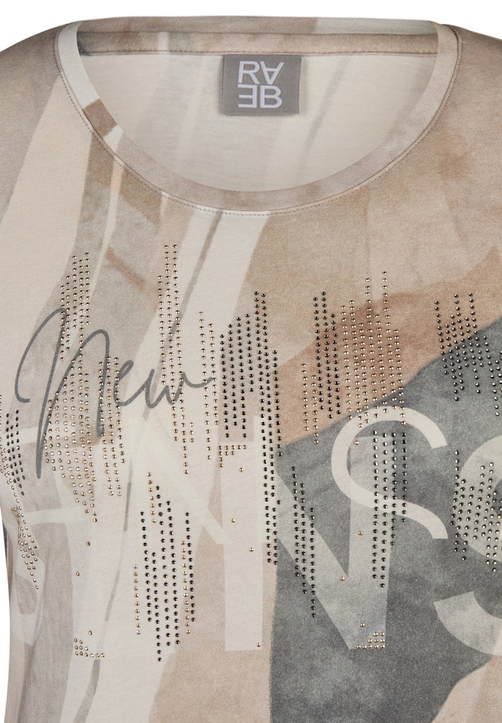 Dieses Shirt kombiniert ein abstraktes Allover-Muster mit einem funkelnden Strassbesatz auf der Vorderseite _ ein dezenter Hingucker für Alltag und Freizeit. Der Materialmix aus Baumwolle und Modal liegt angenehm weich auf der Haut, während der klassische Rundhalsausschnitt und die 3/4-Ärmel das Design alltagstauglich abrunden. Ein stilvolles Oberteil mit Wohlfühlfaktor. Weicher Baumwoll-Modal-Mix. Funkelnde Strassverzierung. 3/4-Ärmel, bequem geschnitten. Rundhalsausschnitt. Abstraktes Allover-Design. Hautfreundlich und pflegeleicht.