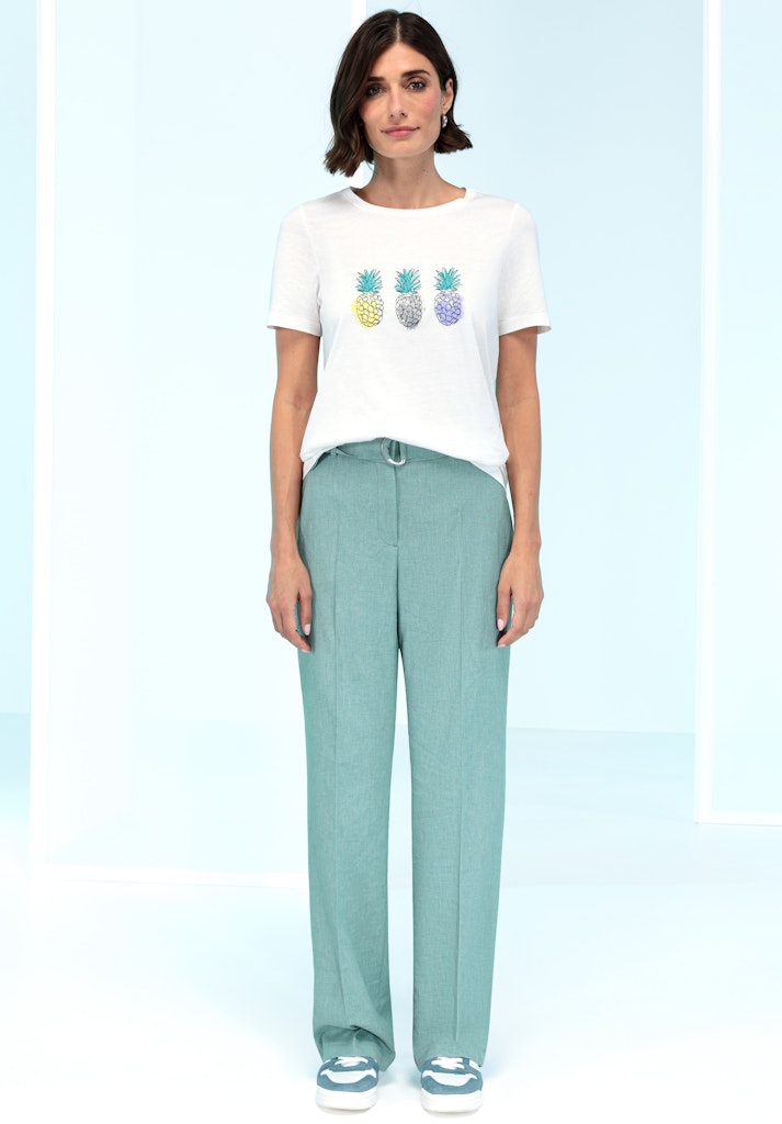 Unser neues Print -Shirt Dinia begeistert mit einem coolen Ananas-Frontprint, der durch funkelnde Strasssteine ergänzt wird. Der Rundhalsausschnitt und die kurzen Ärmel machen das Shirt zu einem vielseitigen Allrounder. Gefertigt aus einem hochwertigen Baumwoll-Modal-Mix, bietet es ein angenehm weiches Tragegefühl. Die gerade, leicht taillierte Passform unterstreicht den modernen Look. Ob lässig zu Jeans oder schick kombiniert mit einer Businesshose - Dinia passt perfekt zu vielen Outfits.