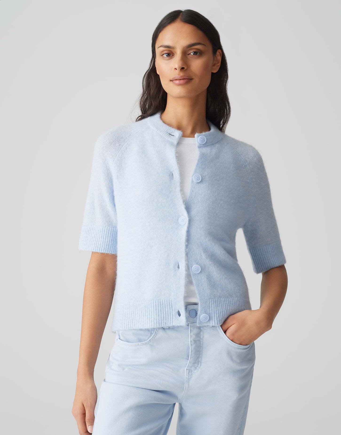 lockere Passform, O-Form, verkürzte Länge, Kurzarm, Rundhalsausschnitt, Rückenlänge ca. 52 cm bei Größe 36, Model Größe 178 cm - trägt Größe 36, Strick, flauschiger Griff, gebürstete Oberfläche, Melange-Effekt, breiter Ripp-Saum, lange Knopfleiste, Raglanärmel