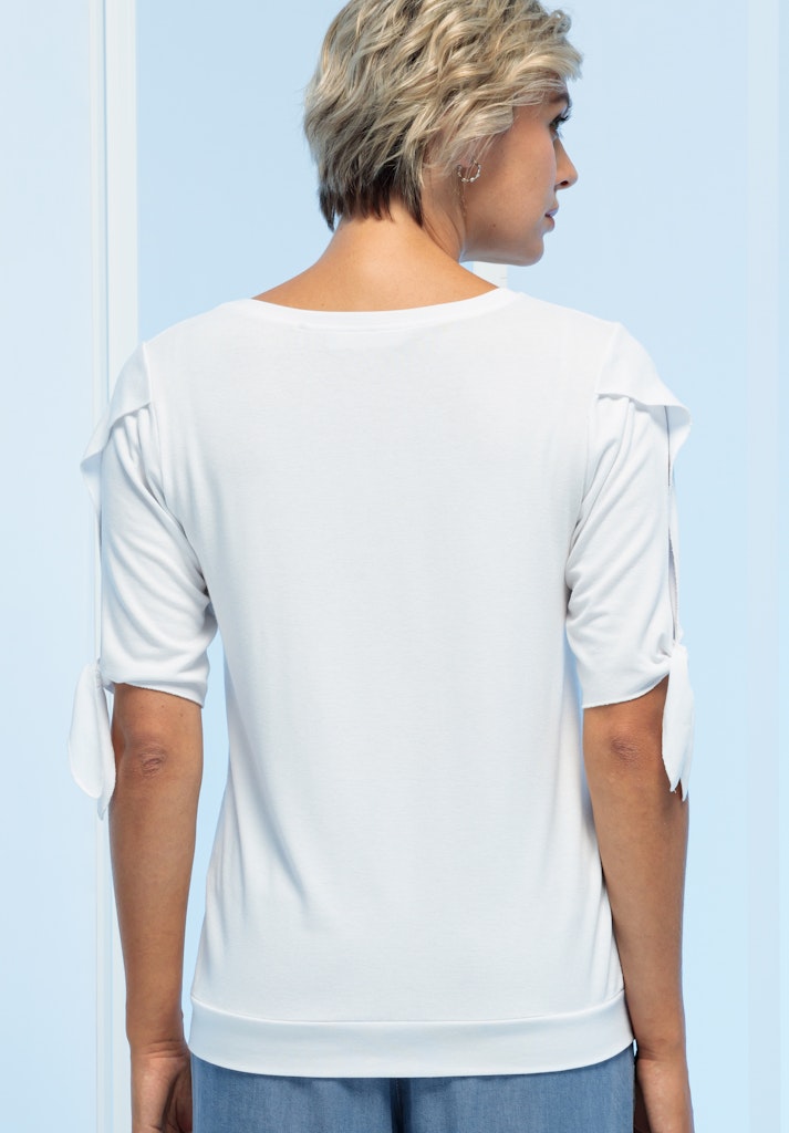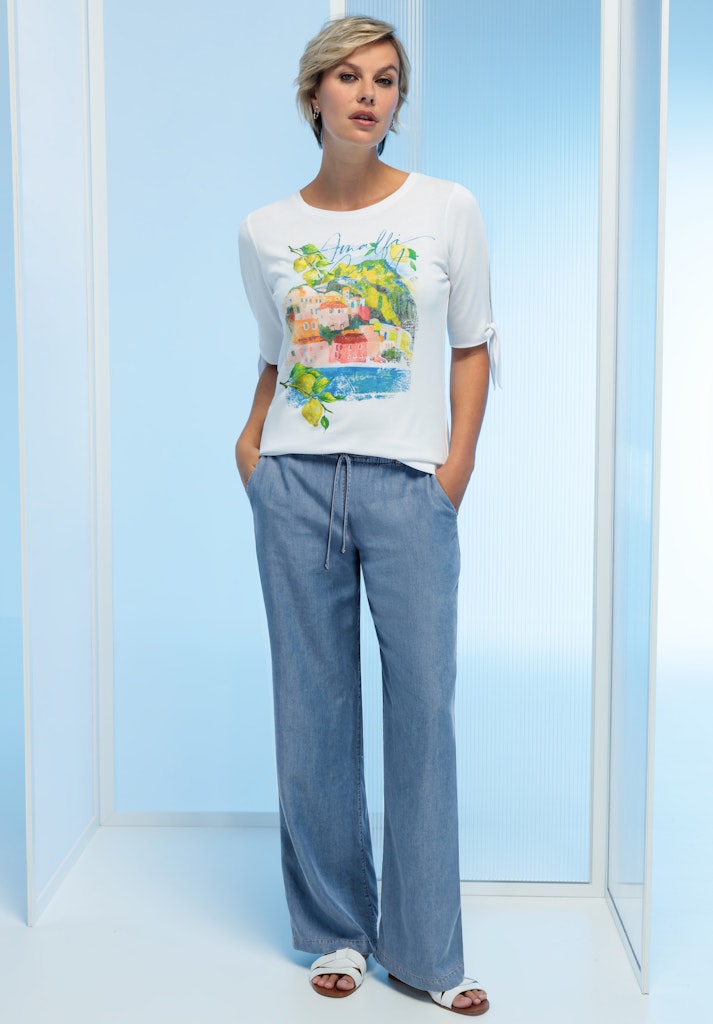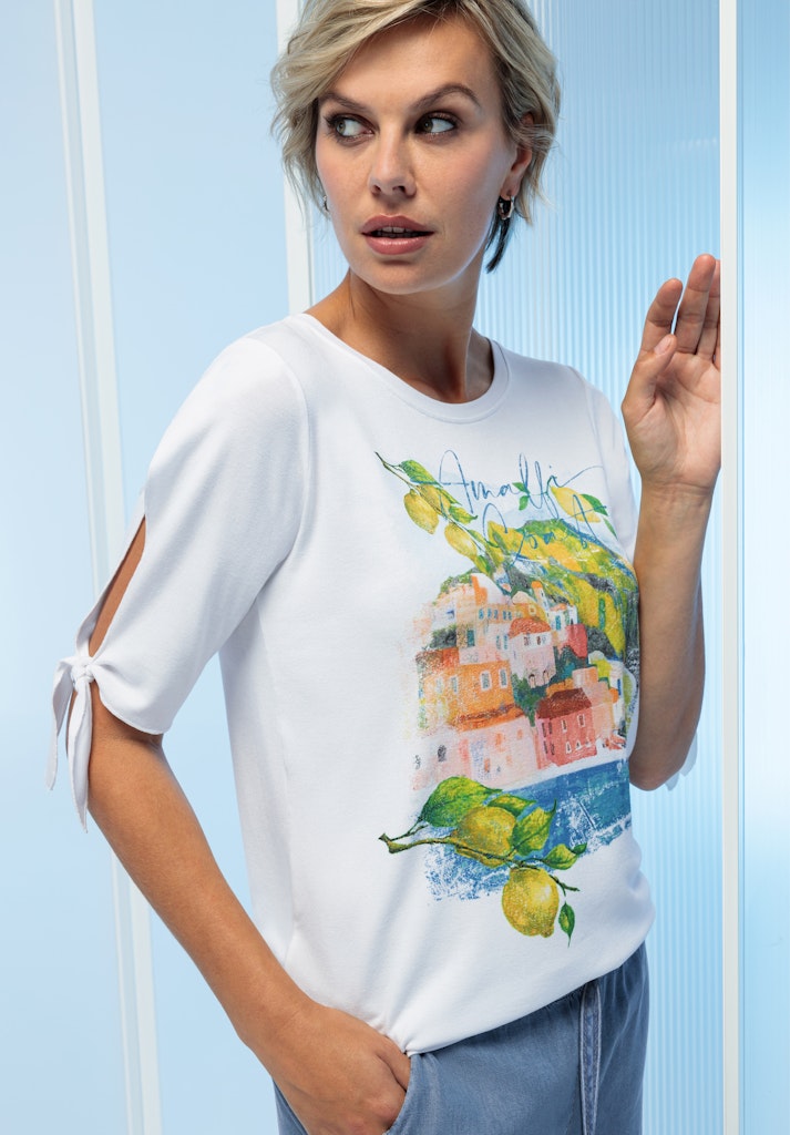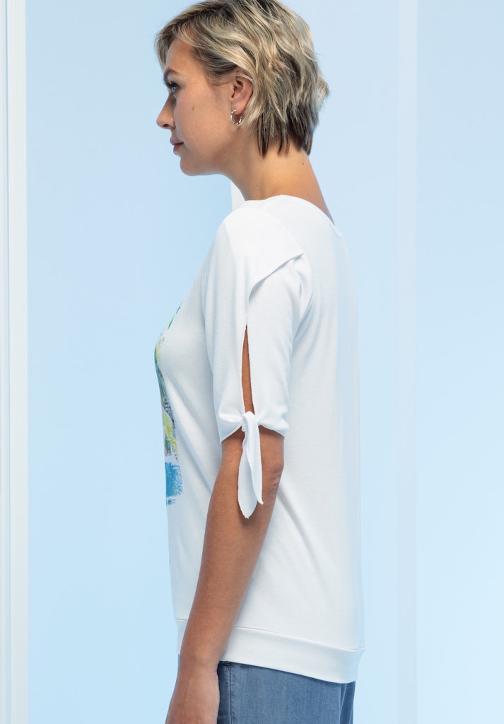 Frischer Wind im Amalfi-Style - unser neues Print-Shirt Elly bringt mit seinem farbigen Print mediterranem Flair und sommerliche Leichtigkeit in Ihre Garderobe. Der klassische Rundhalsausschnitt und der Kurzarm mit Knotendetail setzen stilvolle Akzente. Die lockere Passform mit breitem Saumabschluss sorgt für angenehmen Sitz, während die weiche Baumwollqualität mit Elasthan besonders komfortabel ist. Ob lässig zur Jeansjacke oder schick unter einem Blazer - Elly ist ein vielseitiger Begleiter für sonnige Tage.
