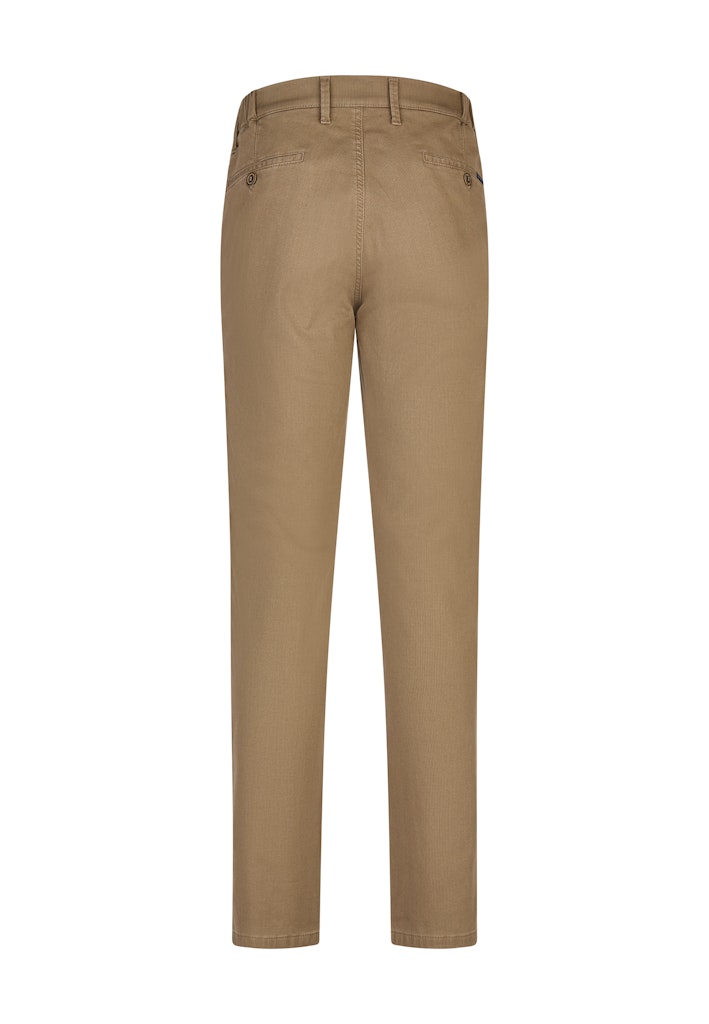 Super bequeme Chino im Slim Fit mit superelastischem Smokbund und Hemdstopper. Gefertigt aus einer hochelastischer High Stretch-Baumwolle in wunderschöner Dobby-Struktur. Das Double Dye-Verfahren verleiht der Hose einen casualigen Look.Gewicht: 445 g/lfm Das Modell bietet eine mittlere Leibhöhe und ein schlankes Bein bei schmaler Fußweite.